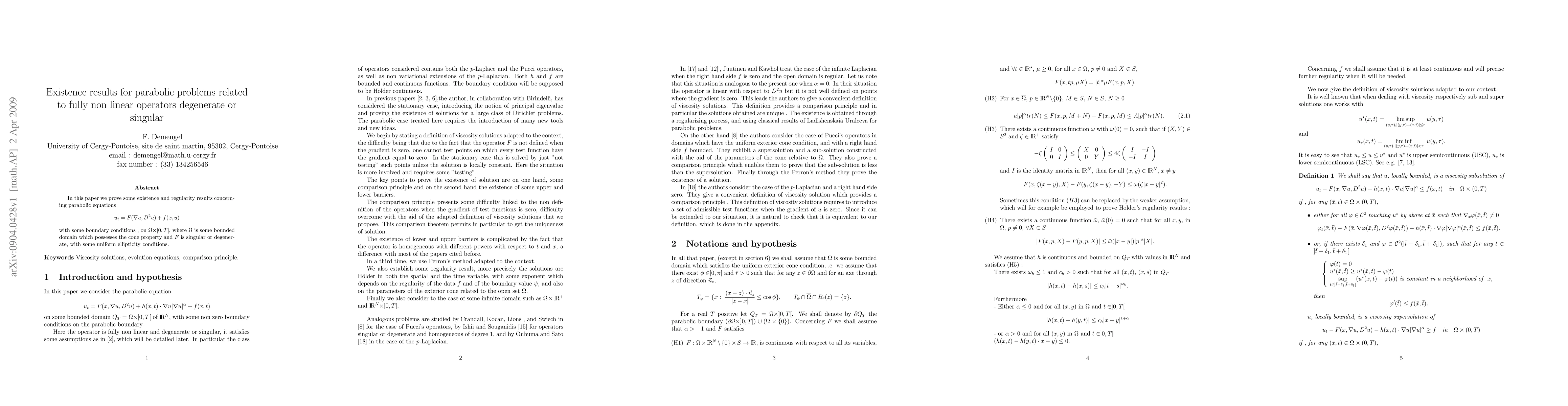 This paper establishes existence and regularity results for parabolic equations involving fully nonlinear operators that are either singular or degenerate, with uniform ellipticity conditions, on bounded domains with the cone property. The study focuses on the equation dtu = F(D u, D2 u) + f(x,u) under specified boundary conditions.