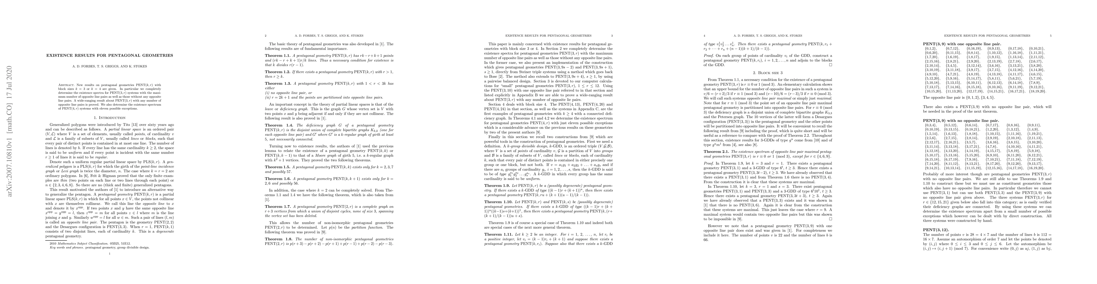 New results on pentagonal geometries PENT(k,r) with block sizes k = 3 or k = 4 are given. In particular we completely determine the existence spectra for PENT(3,r) systems with the maximum number of opposite line pairs as well as those without any opposite line pairs. A wide-ranging result about PENT(3,r) with any number of opposite line pairs is proved. We also determine the existence spectrum of PENT(4,r) systems with eleven possible exceptions.