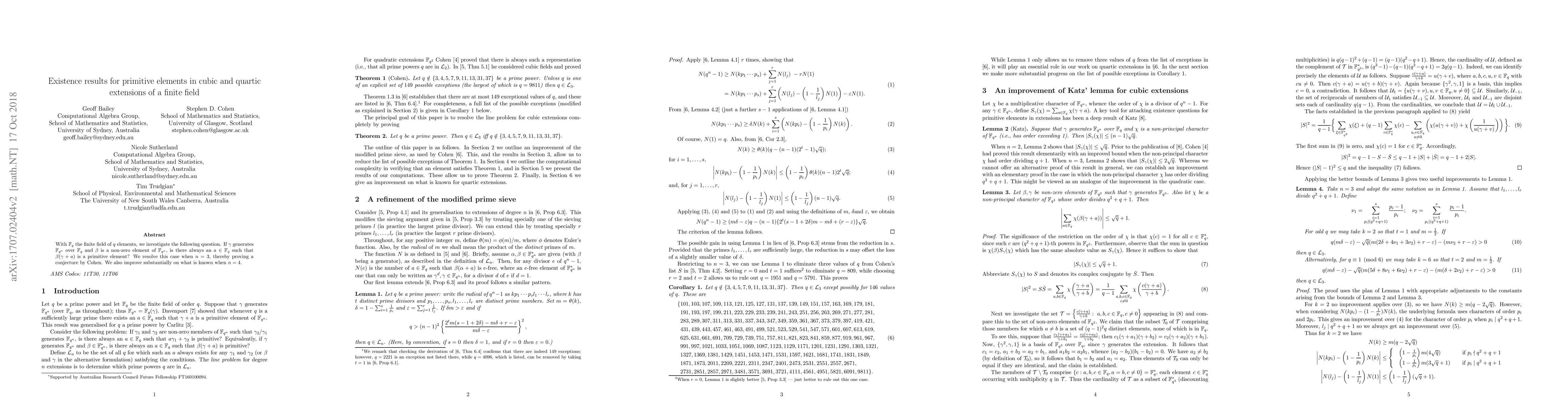 This paper resolves a conjecture by Cohen for cubic field extensions, proving the existence of an $a$ in $Fq$ such that $eta(gamma + a)$ is a primitive element when $gamma$ generates $Fqn$ over $Fq$ and $eta$ is a non-zero element of $Fqn$, specifically for $n=3$. It also significantly advances knowledge for quartic field extensions ($n=4$).