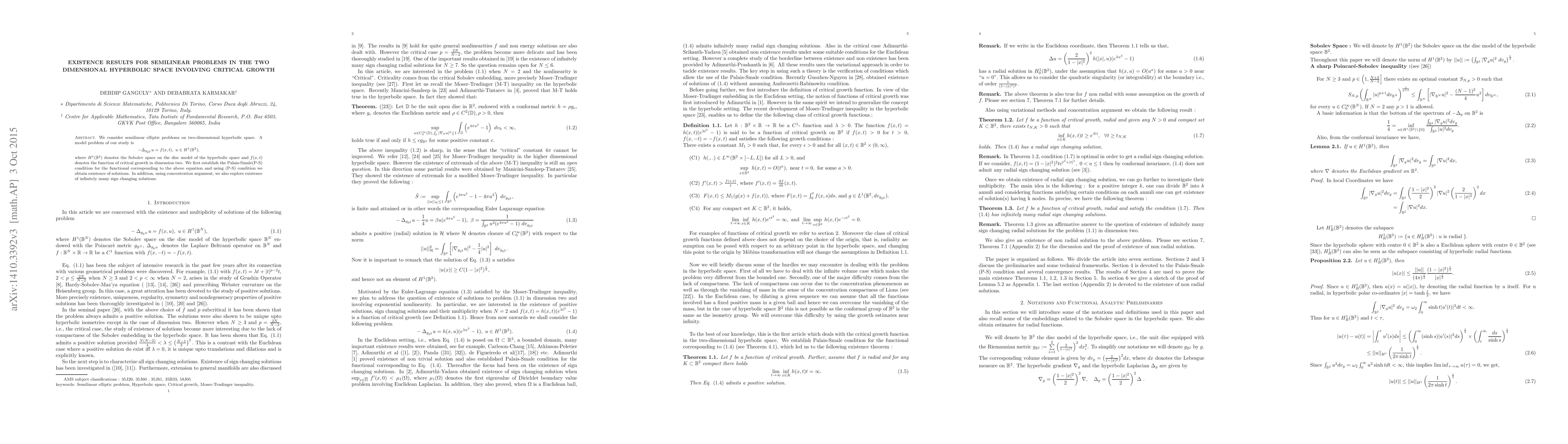We consider semilinear elliptic problems on two-dimensional hyperbolic space involving critical growth. We first establish the Palais-Smale(P-S) condition and using (P-S) condition we obtain existence of solutions. In addition, we also explore existence of infinitely many sign changing solutions as well.