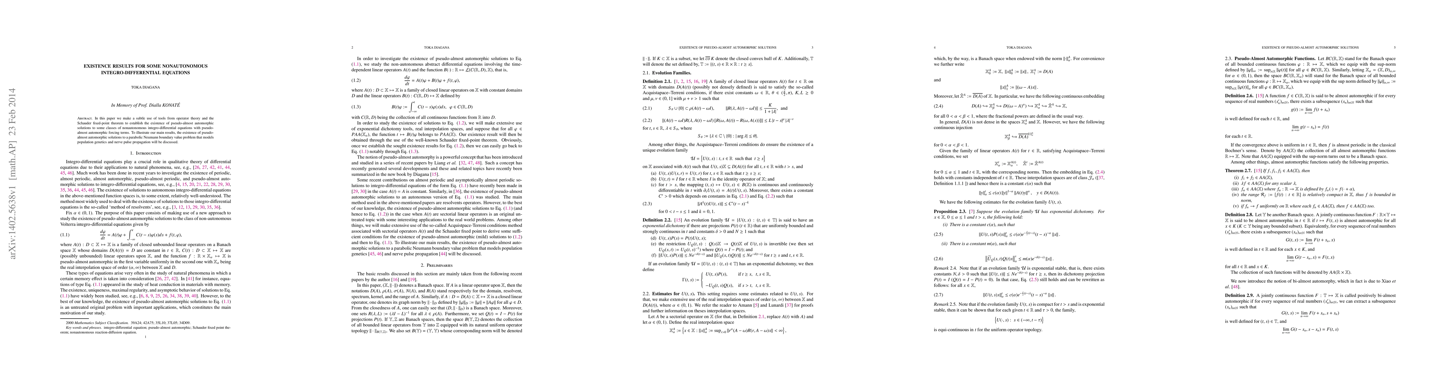 In this paper we make a subtle use of tools from operator theory and the Schauder fixed-point theorem to establish the existence of pseudo-almost automorphic solutions to some classes of nonautonomous integro-differential equations with pseudo-almost automorphic forcing terms. To illustrate our main results, the existence of pseudo-almost automorphic solutions to a parabolic Neumann boundary value problem that models population genetics and nerve pulse propagation will be discussed.