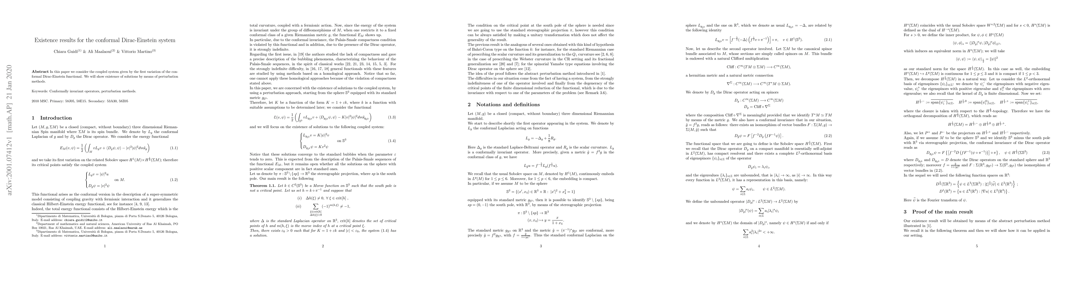 In this paper we consider the coupled system given by the first variation of the conformal Dirac-Einstein functional. We will show existence of solutions by means of perturbation methods.