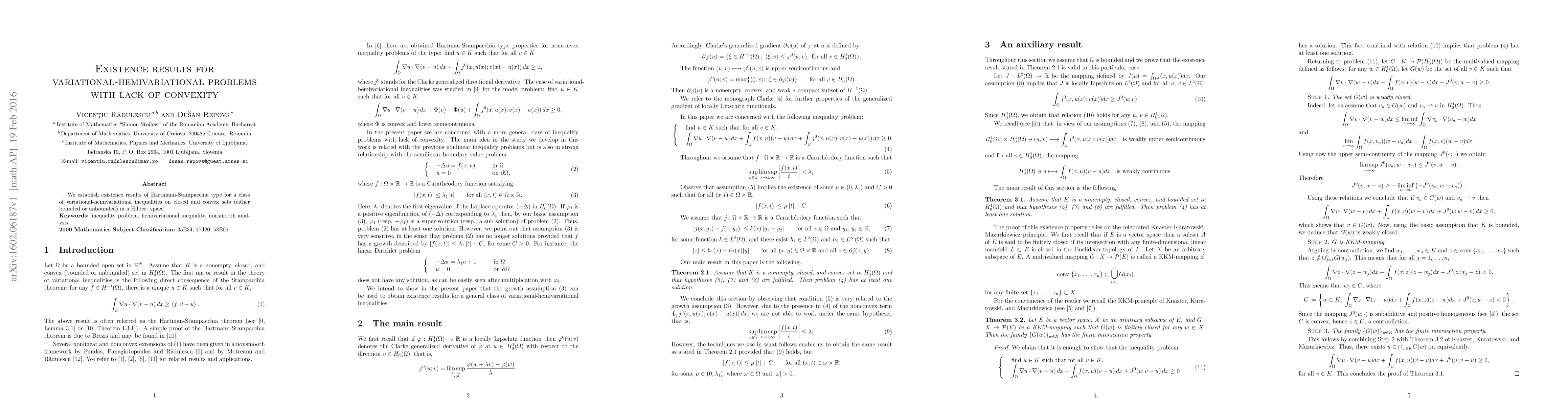 We establish existence results of Hartmann-Stampacchia type for a class of variational-hemivariationalinequalities on closed and convex sets (either bounded or unbounded) in a Hilbert space.