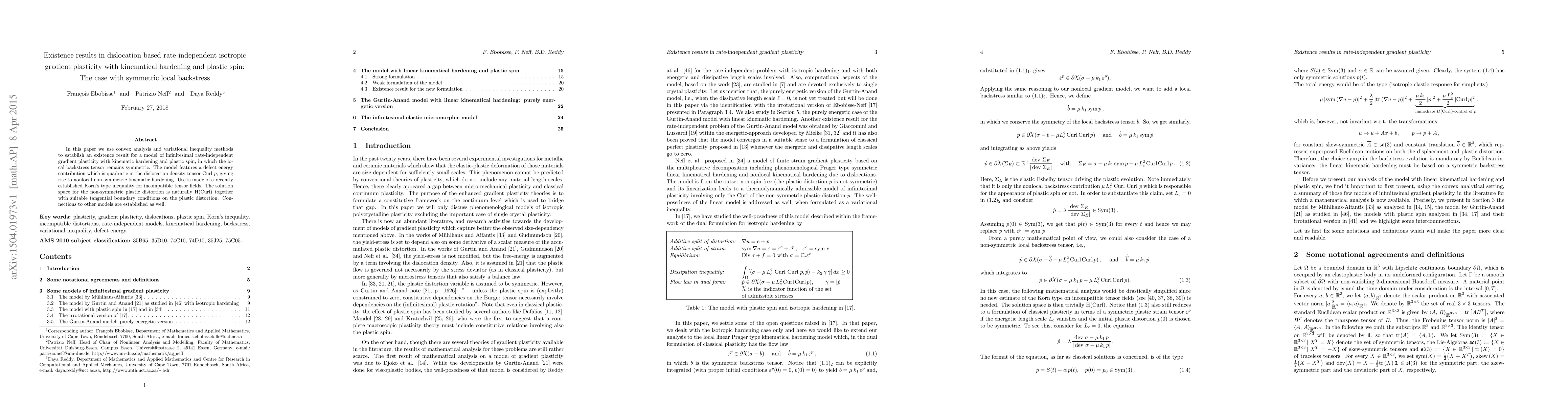 This paper establishes an existence result for a rate-independent gradient plasticity model with kinematic hardening and plastic spin, using convex analysis and variational inequalities. The model incorporates a symmetric local backstress tensor and a quadratic defect energy term, leveraging a Korn's type inequality for incompatible tensor fields.