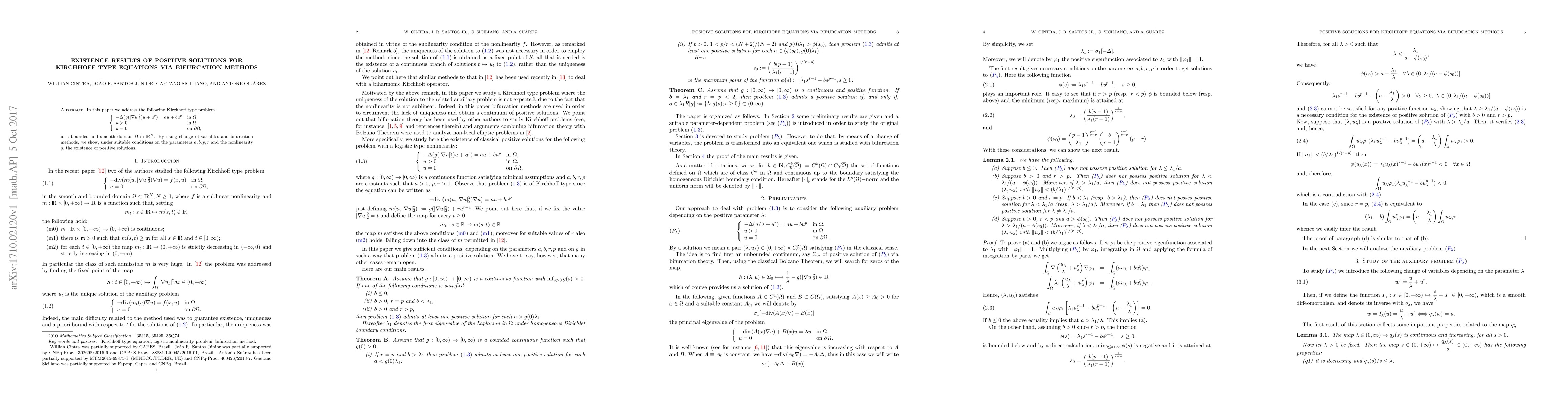 In this paper we address the following Kirchhoff type problem \begin{equation*} \left\{ \begin{array}{ll} -\Delta(g(|\nabla u|_2^2) u + u^r) = a u + b u^p& \mbox{in}~\Omega, u>0& \mbox{in}~\Omega, u= 0& \mbox{on}~\partial\Omega, \end{array} \right. \end{equation*} in a bounded and smooth domain $\Omega$ in ${\rm I}\hskip -0.85mm{\rm R}$. By using change of variables and bifurcation methods, we show, under suitable conditions on the parameters $a,b,p,r$ and the nonlinearity $g$, the existence of positive solutions.
