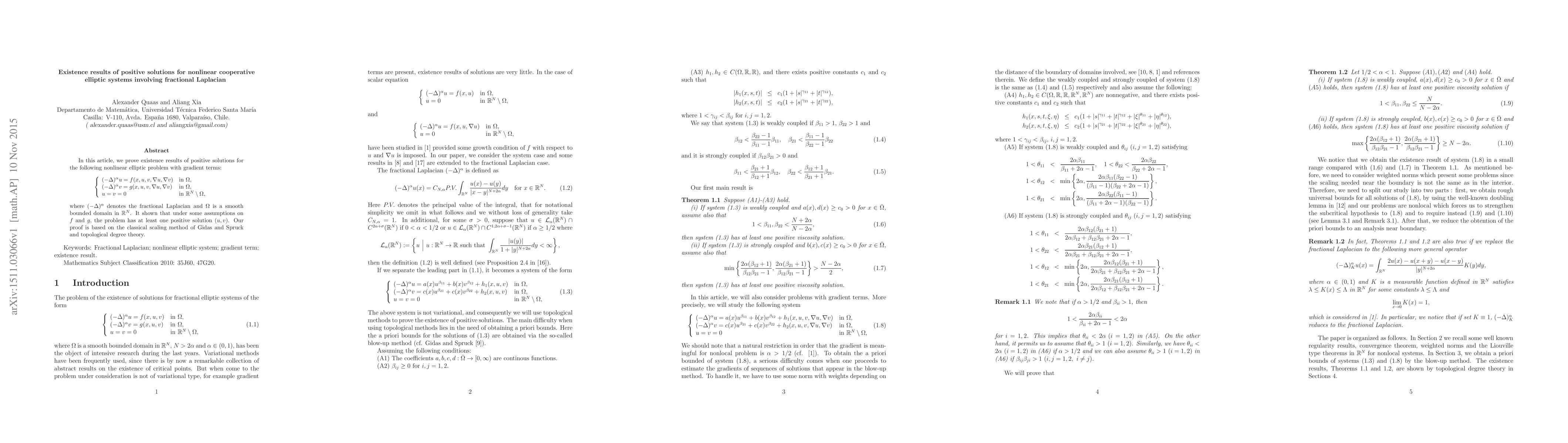 This paper proves the existence of positive solutions for a nonlinear cooperative elliptic system involving the fractional Laplacian, showing that under certain conditions on the functions \( f \) and \( g \), the system has at least one positive solution \((u,v)\). The proof utilizes the scaling method and topological degree theory.