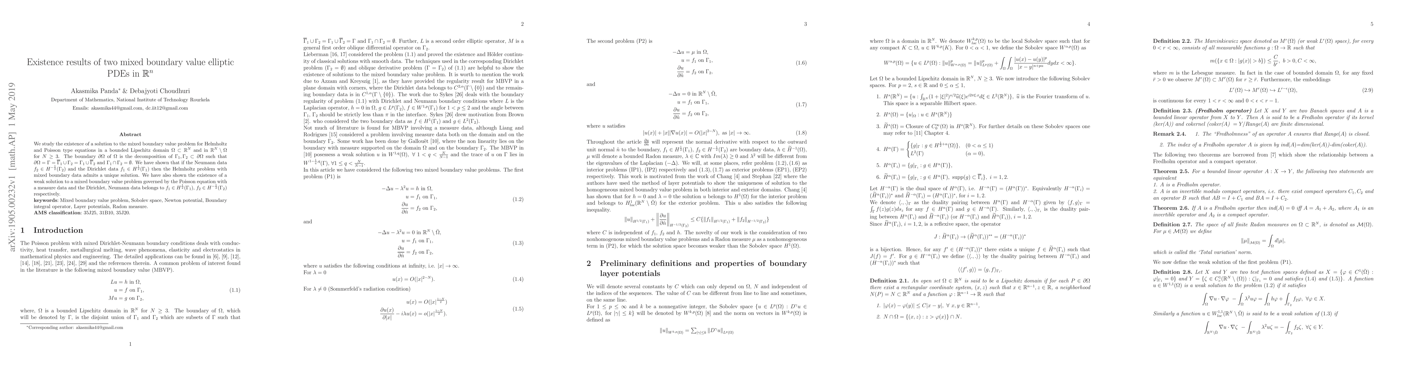We study the existence of a solution to the mixed boundary value problem for Helmholtz and Poisson type equations in a bounded Lipschitz domain $\Omega\subset\mathbb{R}^N$ and in $\mathbb{R}^N\setminus\Omega$ for $N\geq3$. The boundary $\partial\Omega$ of $\Omega$ is the decomposition of $\Gamma_1,\Gamma_2\subset\partial\Omega$ such that $\partial\Omega=\Gamma=\overline{\Gamma}_1\cup\Gamma_2=\Gamma_1\cup\overline{\Gamma}_2$ and $\Gamma_1\cap\Gamma_2=\emptyset$. We have shown that if the Neumann data $f_2\in H^{-\frac{1}{2}}(\Gamma_2)$ and the Dirichlet data $f_1\in H^{\frac{1}{2}}(\Gamma_1)$ then the Helmholtz problem with mixed boundary data admits a unique solution. We have also shown the existence of a weak solution to a mixed boundary value problem governed by the Poisson equation with a measure data and the Dirichlet, Neumann data belongs to $f_1\in H^{\frac{1}{2}}(\Gamma_1)$, $f_2\in H^{-\frac{1}{2}}(\Gamma_2)$ respectively.
