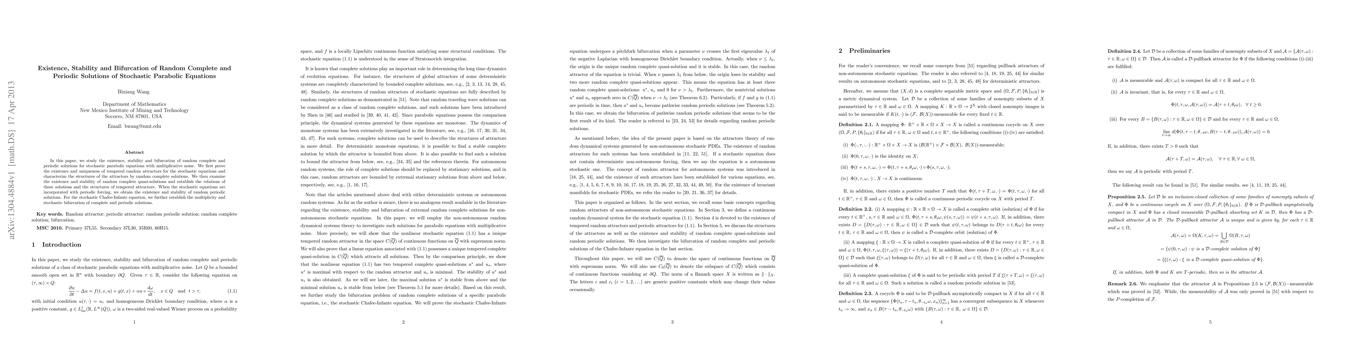 This paper investigates the existence, stability, and bifurcation of random complete and periodic solutions for stochastic parabolic equations with multiplicative noise. It proves the existence and uniqueness of tempered random attractors and explores the stability and bifurcation of these solutions, particularly focusing on the stochastic Chafee-Infante equation.
