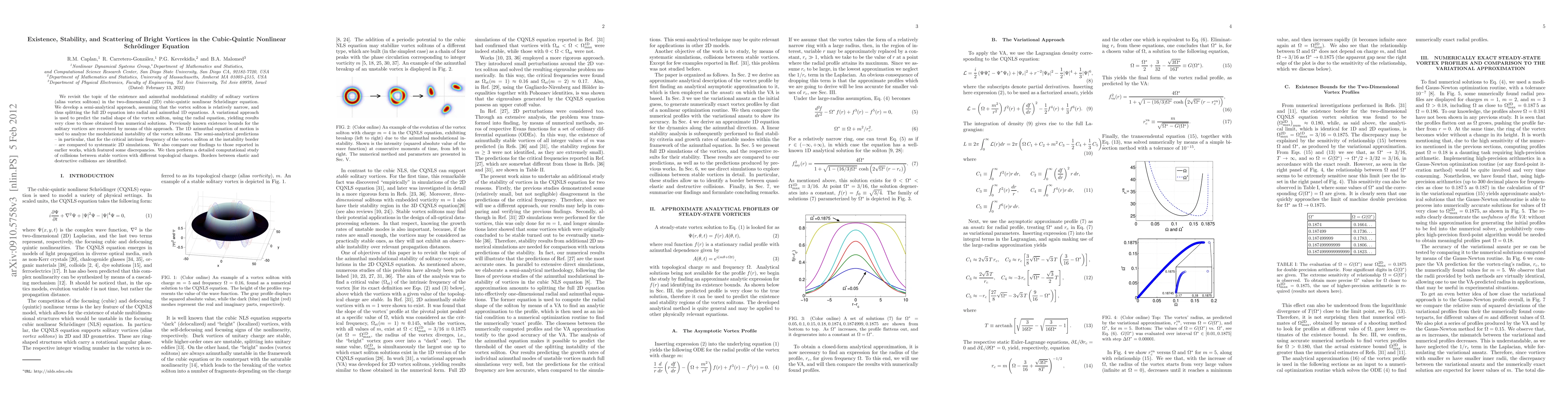 We revisit the topic of the existence and azimuthal modulational stability of solitary vortices (alias vortex solitons) in the two-dimensional (2D) cubic-quintic nonlinear Schr{\"o}dinger equation. We develop a semi-analytical approach, assuming that the vortex soliton is relatively narrow, and thus splitting the full 2D equation into radial and azimuthal 1D equations. A variational approach is used to predict the radial shape of the vortex soliton, using the radial equation, yielding results very close to those obtained from numerical solutions. Previously known existence bounds for the solitary vortices are recovered by means of this approach. The 1D azimuthal equation of motion is used to analyze the modulational instability of the vortex solitons. The semi-analytical predictions -- in particular, that for the critical intrinsic frequency of the vortex soliton at the instability border -- are compared to systematic 2D simulations. We also compare our findings to those reported in earlier works, which featured some discrepancies. We then perform a detailed computational study of collisions between stable vortices with different topological charges. Borders between elastic and destructive collisions are identified.