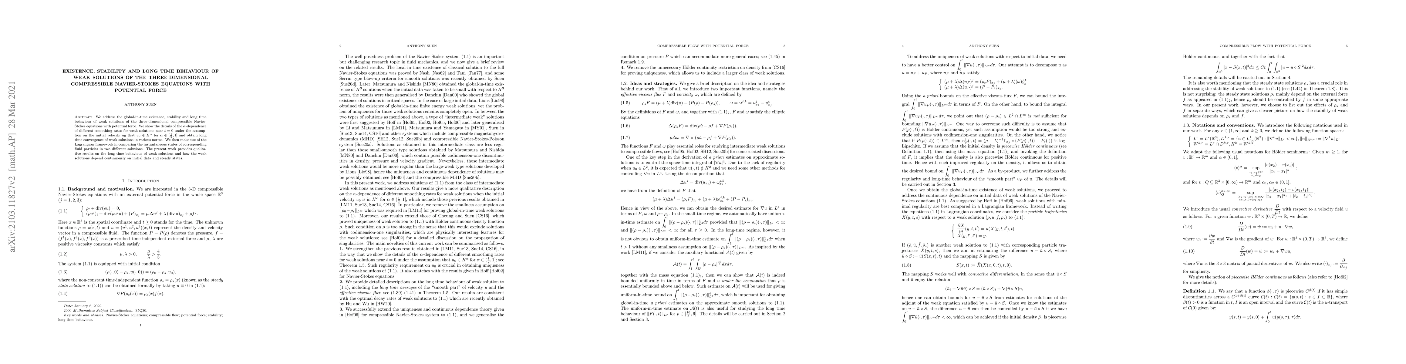 This paper investigates the existence, stability, and long-term behavior of weak solutions to the three-dimensional compressible Navier-Stokes equations with potential force. It demonstrates the $\alpha$-dependence of smoothing rates for weak solutions and establishes their convergence in various norms over time, while employing a Lagrangian framework to compare fluid particle states.