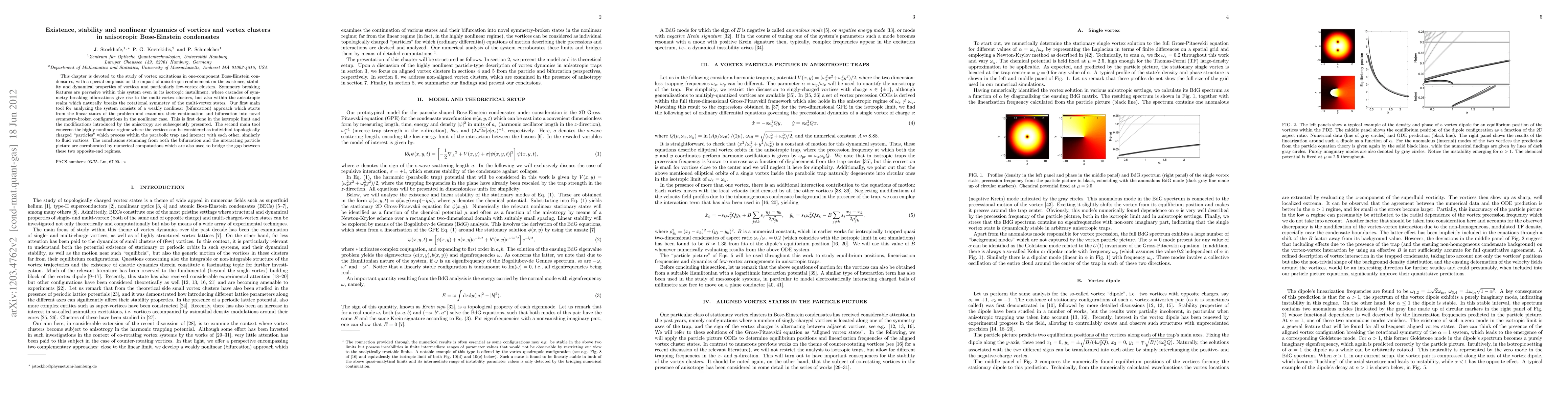 This paper investigates vortex dynamics in anisotropic Bose-Einstein condensates, focusing on how anisotropy affects vortex existence, stability, and clustering. It employs both weakly nonlinear bifurcation analysis and highly nonlinear interacting particle models to explore these phenomena, supported by numerical simulations.