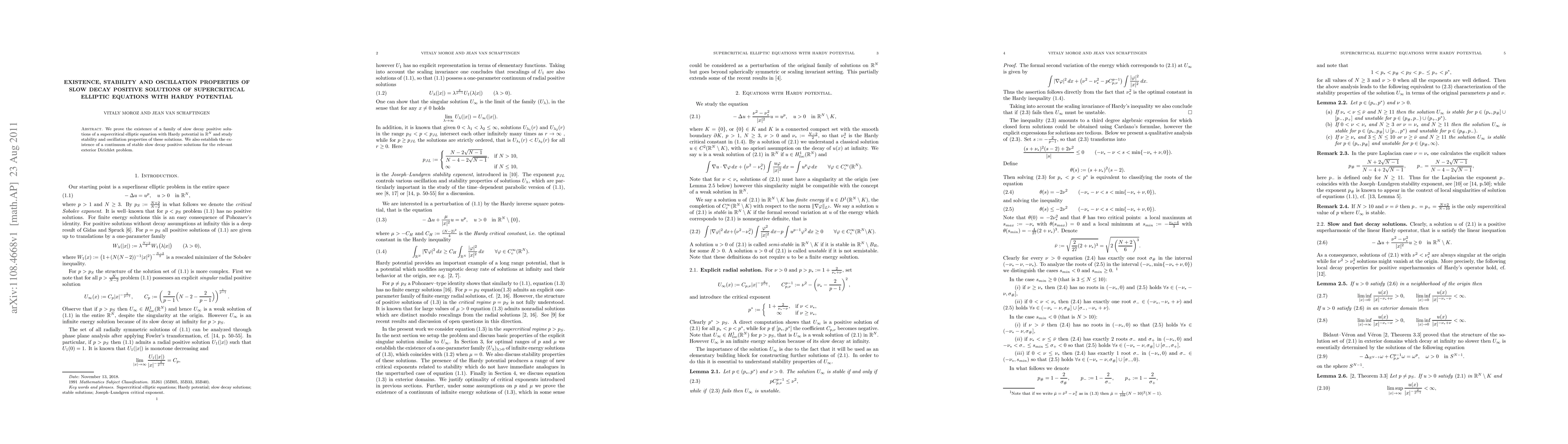 We prove the existence of a family of slow decay positive solutions of a supercritical elliptic equation with Hardy potential in the entire space and study stability and oscillation properties of these solutions. We also establish the existence of a continuum of stable slow decay positive solutions for the relevant exterior Dirichlet problem.