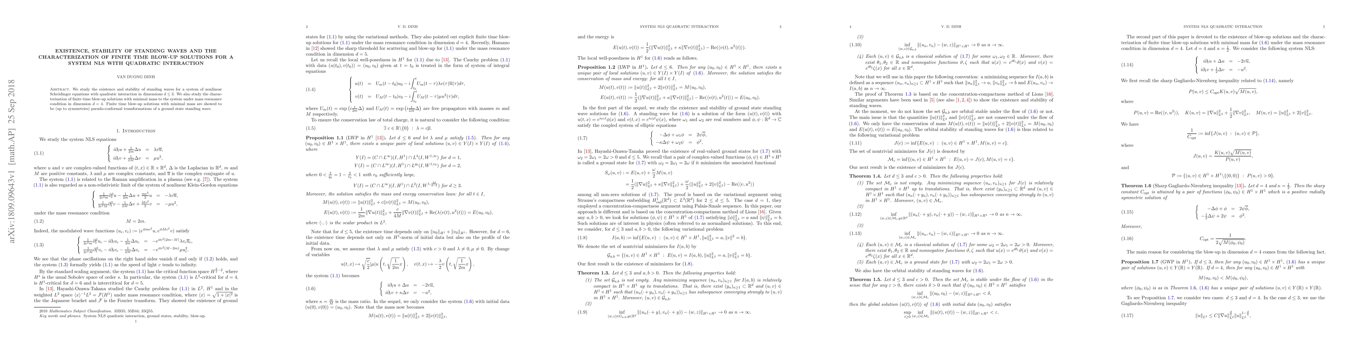 Summary: This paper investigates the existence and stability of standing waves in a system of nonlinear Schrödinger equations with quadratic interaction, and characterizes the minimal mass finite time blow-up solutions under mass resonance conditions in dimension four, revealing that such blow-up solutions are pseudo-conformal transformations of a ground state standing wave.