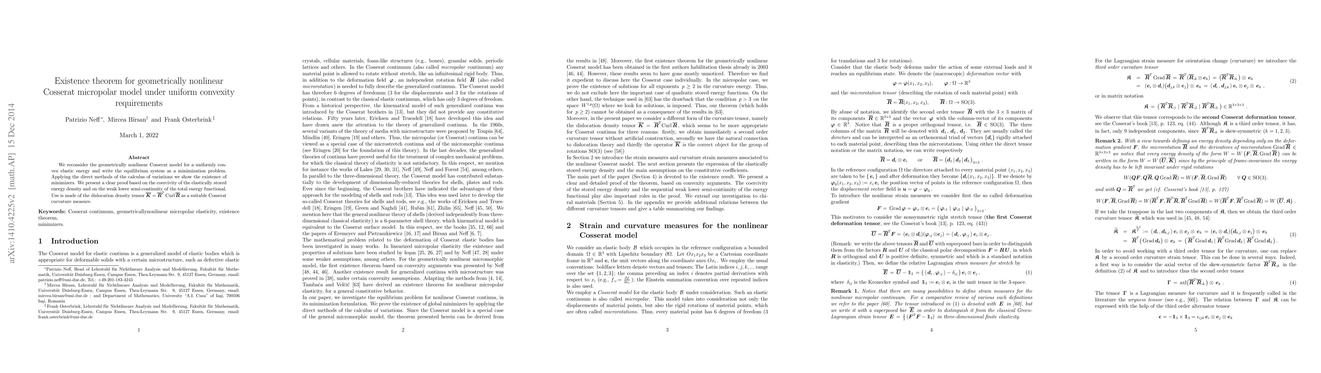 We reconsider the geometrically nonlinear Cosserat model for a uniformly convex elastic energy and write the equilibrium problem as a minimization problem. Applying the direct methods of the calculus of variations we show the existence of minimizers. We present a clear proof based on the coercivity of the elastically stored energy density and on the weak lower semi-continuity of the total energy functional. Use is made of the dislocation density tensor $\bar{\boldsymbol{K}}=\bar{\boldsymbol{R}}^T\,\mathrm{Curl}\,\bar{\boldsymbol{R}}$ as a suitable Cosserat curvature measure.