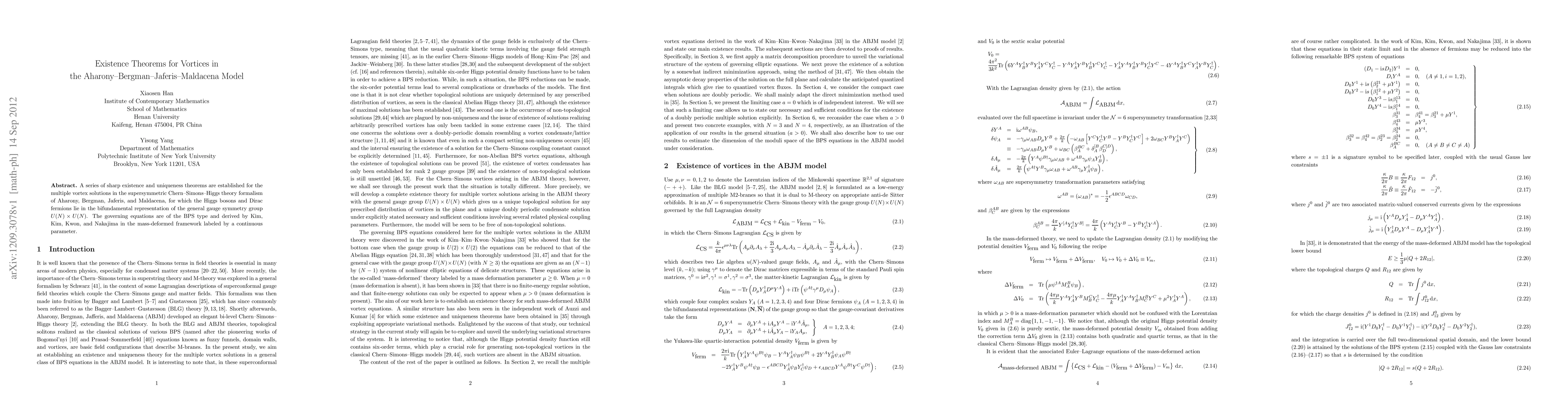 A series of sharp existence and uniqueness theorems are established for the multiple vortex solutions in the supersymmetric Chern--Simons--Higgs theory formalism of Aharony, Bergman, Jaferis, and Maldacena, for which the Higgs bosons and Dirac fermions lie in the bifundamental representation of the general gauge symmetry group $U(N)\times U(N)$. The governing equations are of the BPS type and derived by Kim, Kim, Kwon, and Nakajima in the mass-deformed framework labeled by a continuous parameter.