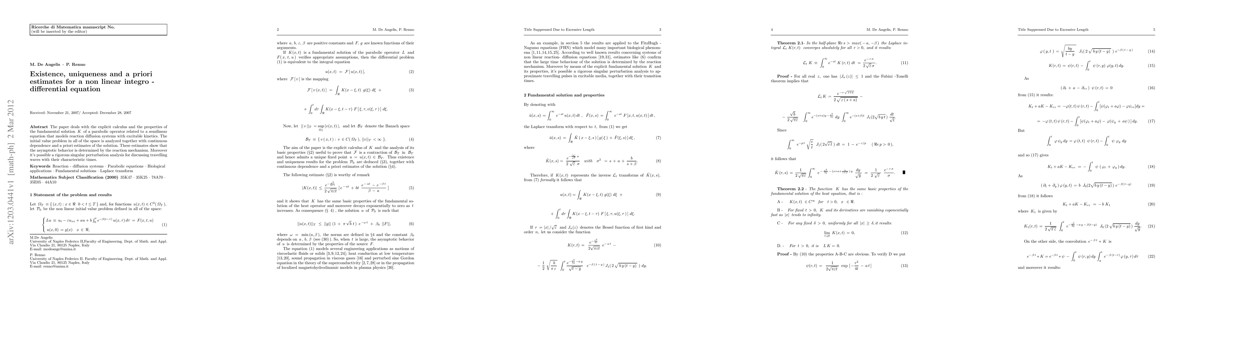 The paper deals with the explicit calculus and the properties of the fundamental solution K of a parabolic operator related to a semilinear equation that models reaction diffusion systems with excitable kinetics. The initial value problem in all of the space is analyzed together with continuous dependence and a priori estimates of the solution. These estimates show that the asymptotic behavior is determined by the reaction mechanism. Moreover it's possible a rigorous singular perturbation analysis for discussing travelling waves with their characteristic times.