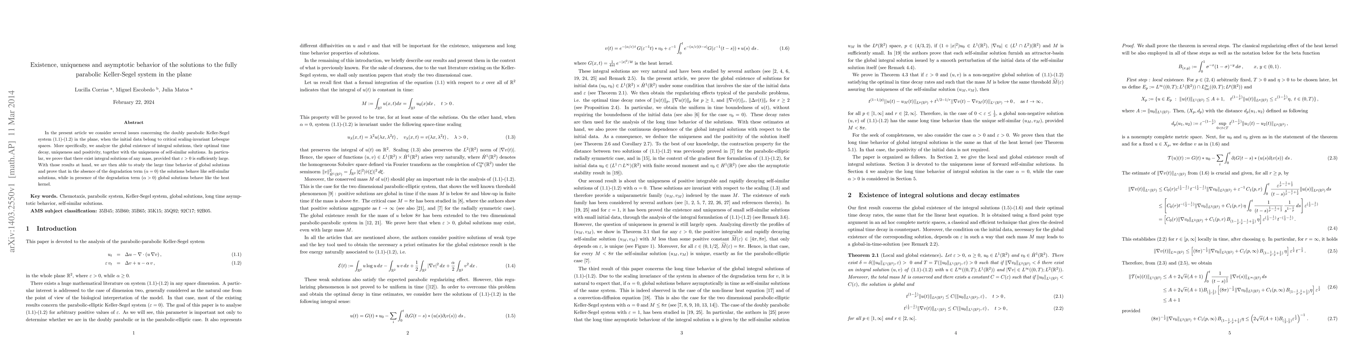 In the present article we consider several issues concerning the doubly parabolic Keller-Segel system in the plane, when the initial data belong to critical scaling-invariant Lebesgue spaces. More specifically, we analyze the global existence of integral solutions, their optimal time decay, uniqueness and positivity, together with the uniqueness of self-similar solutions. In particular, we prove that there exist integral solutions of any mass, provided that $\e>0$ is sufficiently large. With those results at hand, we are then able to study the large time behavior of global solutions and prove that in the absence of the degradation term the solutions behave like self-similar solutions, while in presence of the degradation term global solutions behave like the heat kernel.