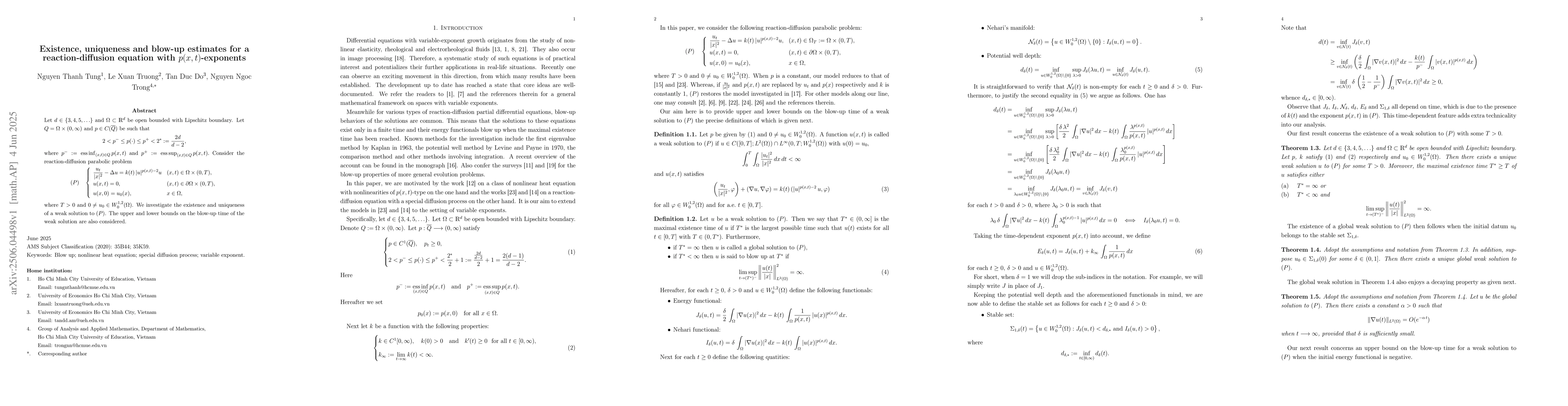 The paper investigates the existence, uniqueness, and blow-up estimates for a reaction-diffusion equation with $p(x,t)$-exponents in a bounded domain $\Omega \subset \mathbb{R}^d$ with Lipschitz boundary, where $d \geq 3$. The problem considers a weak solution $u$ satisfying specific initial and boundary conditions.