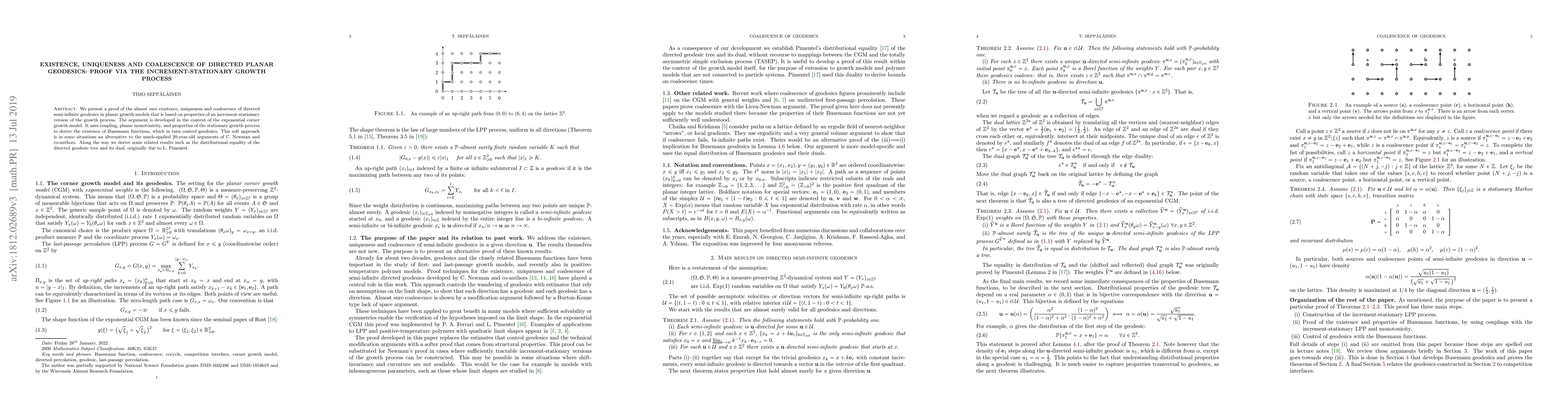 This paper proves the almost sure existence, uniqueness, and coalescence of directed semi-infinite geodesics in planar growth models using an increment-stationary growth process. It employs coupling, planar monotonicity, and stationary growth properties to establish Busemann functions that control geodesics.