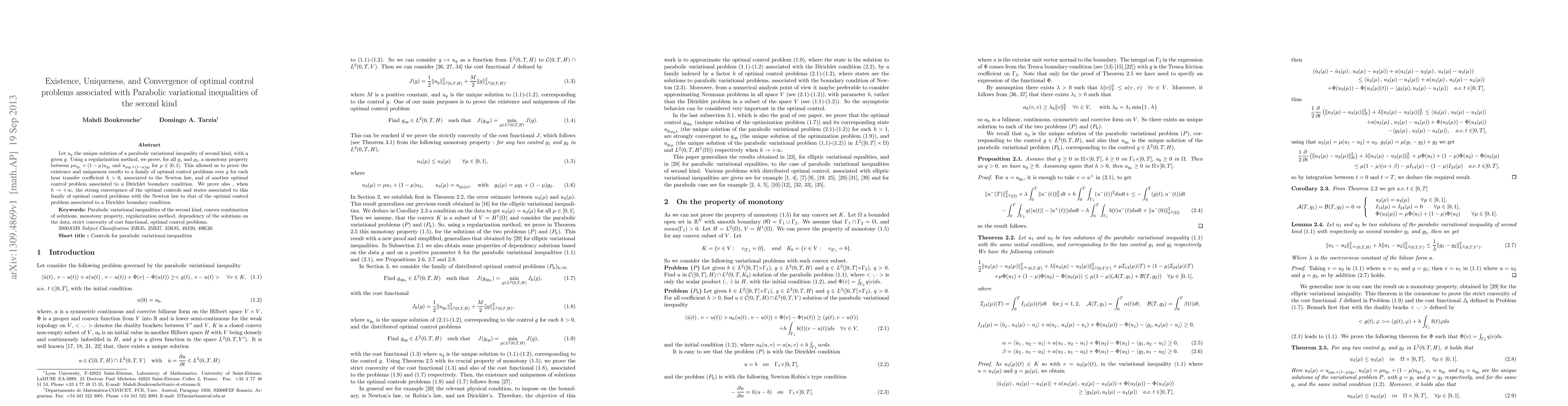 This paper proves the existence, uniqueness, and strong convergence for optimal control problems linked to parabolic variational inequalities of the second kind. It establishes a monotonicity property and demonstrates the convergence of optimal controls and states under certain conditions.