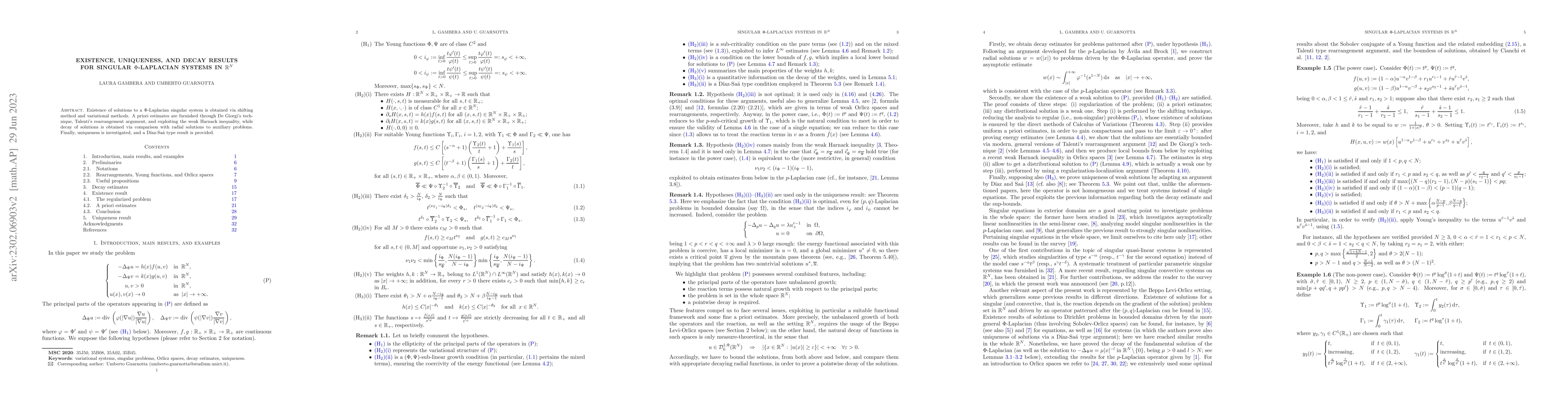 Existence of solutions to a $\Phi$-Laplacian singular system is obtained via shifting method and variational methods. A priori estimates are furnished through De Giorgi's technique, Talenti's rearrangement argument, and exploiting the weak Harnack inequality, while decay of solutions is obtained via comparison with radial solutions to auxiliary problems. Finally, uniqueness is investigated, and a Diaz-Saa type result is provided.