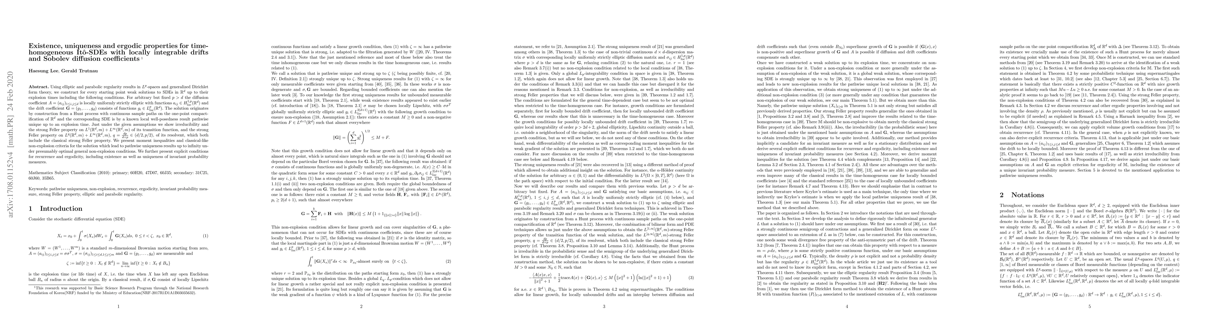Using elliptic and parabolic regularity results in $L^p$-spaces and generalized Dirichlet form theory, we construct for every starting point weak solutions to SDEs in $\mathbb{R}^d$ up to their explosion times including the following conditions. For arbitrary but fixed $p>d$ the diffusion coefficient $A=(a_{ij})_{1\le i,j\le d}$ is locally uniformly strictly elliptic with functions $a_{ij}\in H^{1,p}_{loc}(\mathbb{R}^d)$ and the drift coefficient $\mathbf{G}=(g_1,\dots, g_d)$ consists of functions $g_i\in L^p_{loc}(\mathbb{R}^d)$. The solution originates by construction from a Hunt process with continuous sample paths on the one-point compactification of $\mathbb{R}^d$ and the corresponding SDE is by a known local well-posedness result pathwise unique up to an explosion time. Just under the given assumptions we show irreducibility and the strong Feller property on $L^{1}(\mathbb{R}^d,m)+L^{\infty}(\mathbb{R}^d,m)$ of its transition function, and the strong Feller property on $L^{q}(\mathbb{R}^d,m)+L^{\infty}(\mathbb{R}^d,m)$, $q=\frac{dp}{d+p}\in (d/2,p/2)$, of its resolvent, which both include the classical strong Feller property. We present moment inequalities and classical-like non-explosion criteria for the solution which lead to pathwise uniqueness results up to infinity under presumably optimal general non-explosion conditions. We further present explicit conditions for recurrence and ergodicity, including existence as well as uniqueness of invariant probability measures.