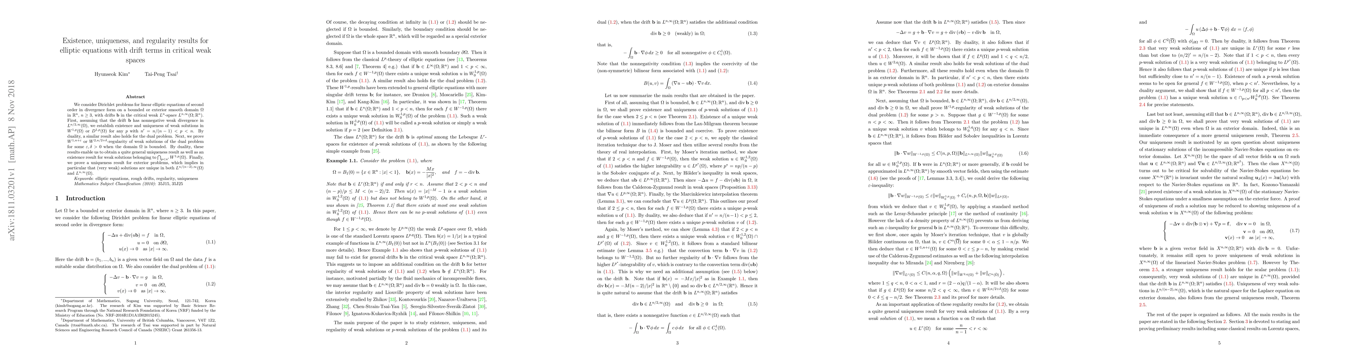 This paper establishes existence, uniqueness, and regularity results for linear elliptic equations with drift in critical weak spaces. It proves existence and uniqueness of weak solutions in $W^{1,p}(\Omega)$ for $n' = n/(n-1) < p < n$, and $W^{1,n+\varepsilon}$ or $W^{2,n/2+\delta}$-regularity for bounded domains, concluding with a uniqueness result for exterior problems.