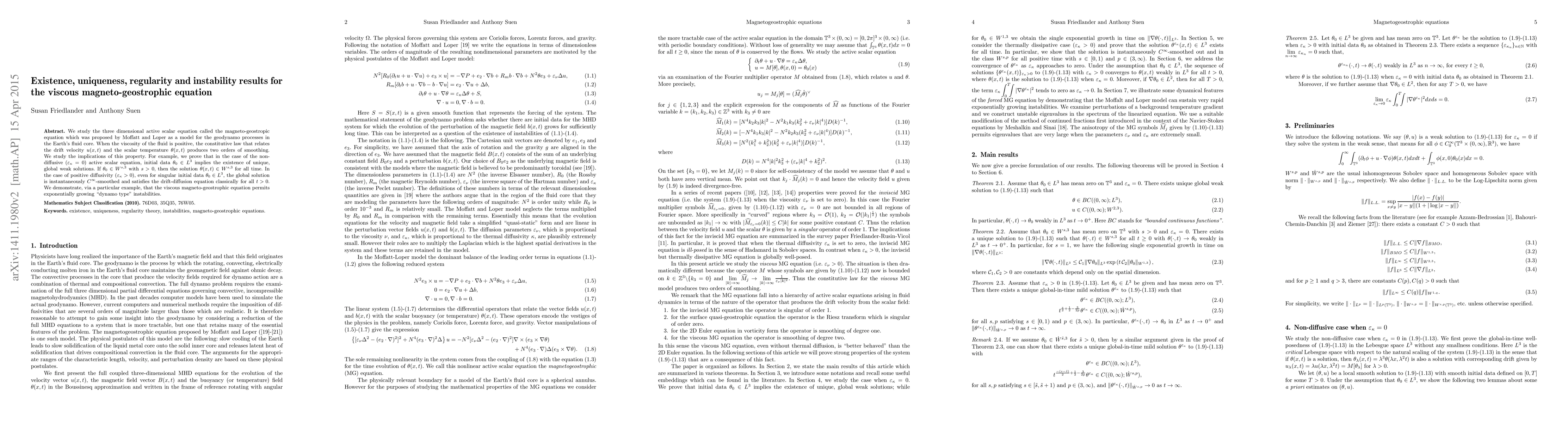 We study the three dimensional active scalar equation called the magneto-geostropic equation which was proposed by Moffatt and Loper as a model for the geodynamo processes in the Earth's fluid core. When the viscosity of the fluid is positive, the constitutive law that relates the drift velocity $u(x,t)$ and the scalar temperature $\theta(x,t)$ produces two orders of smoothing. We study the implications of this property. For example, we prove that in the case of the non-diffusive ($\varepsilon_\kappa=0$) active scalar equation, initial data $\theta_0\in L^3$ implies the existence of unique, global weak solutions. If $\theta_0\in W^{s,3}$ with $s>0$, then the solution $\theta(x,t)\in W^{s,3}$ for all time. In the case of positive diffusivity ($\varepsilon_\kappa>0$), even for singular initial data $\theta_0\in L^3$, the global solution is instantaneously $C^\infty$-smoothed and satisfies the drift-diffusion equation classically for all $t>0$. We demonstrate, via a particular example, that the viscous magneto-geostrophic equation permits exponentially growing "dynamo type" instabilities.