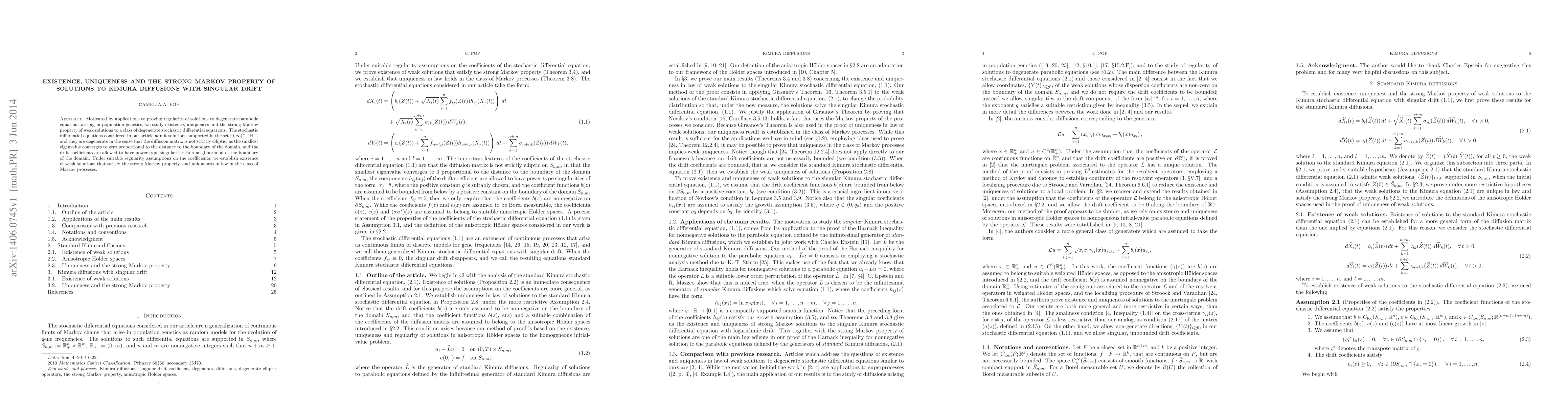 Motivated by applications to proving regularity of solutions to degenerate parabolic equations arising in population genetics, we study existence, uniqueness and the strong Markov property of weak solutions to a class of degenerate stochastic differential equations. The stochastic differential equations considered in our article admit solutions supported in the set $[0,\infty)^n\times\mathbb{R}^m$, and they are degenerate in the sense that the diffusion matrix is not strictly elliptic, as the smallest eigenvalue converges to zero proportional to the distance to the boundary of the domain, and the drift coefficients are allowed to have power-type singularities in a neighborhood of the boundary of the domain. Under suitable regularity assumptions on the coefficients, we establish existence of weak solutions that satisfy the strong Markov property, and uniqueness in law in the class of Markov processes.