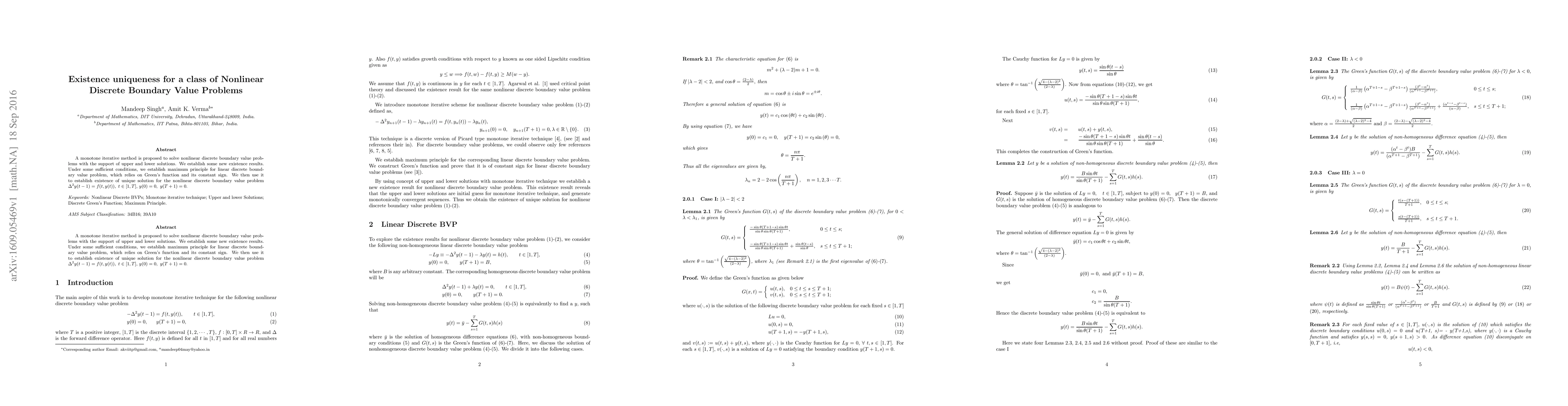 This paper proposes a monotone iterative method to solve nonlinear discrete boundary value problems using upper and lower solutions, establishing new existence results. It leverages a maximum principle for linear problems, supported by Green's function, to prove the existence and uniqueness of solutions for the nonlinear problem $\Delta^2 y(t-1)=f(t, y(t))$ with specified boundary conditions.