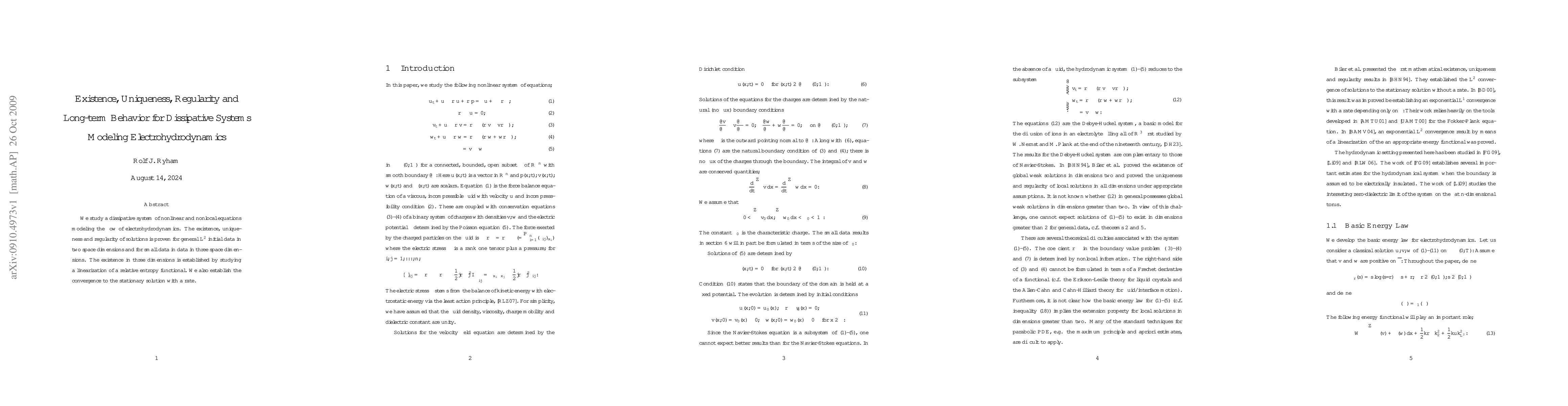This paper proves the existence, uniqueness, and regularity of solutions for a dissipative system modeling electrohydrodynamics, focusing on two-dimensional $\mathbf{L}^2$ initial data and small data in three dimensions. It also establishes convergence to a stationary solution with a specified rate.