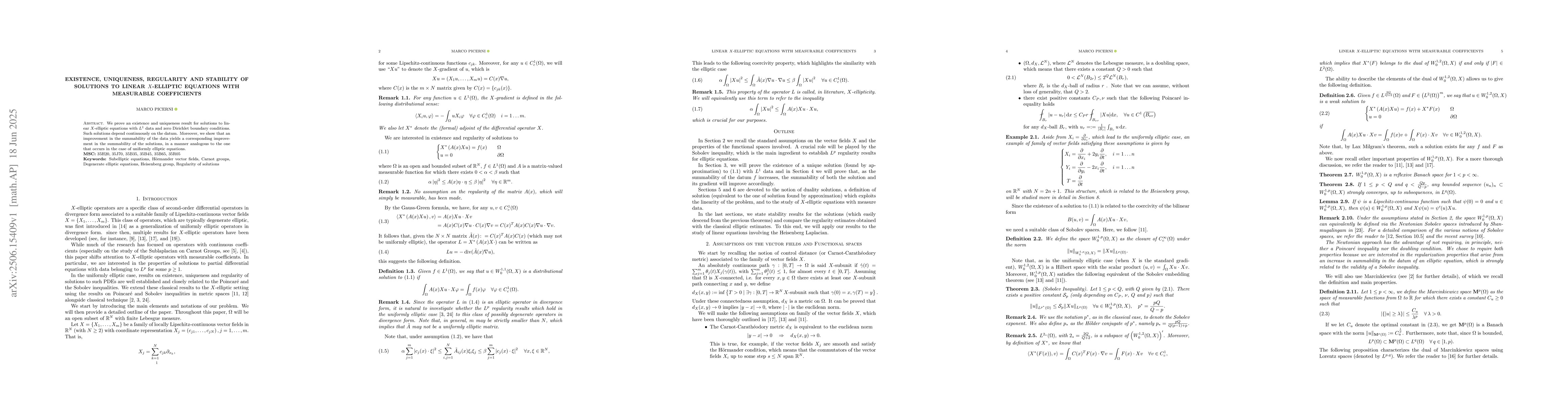 We prove an existence and uniqueness result for solutions to linear $X$-elliptic equations with $L^1$ data and zero Dirichlet boundary conditions. Such solutions depend continuously on the datum. Moreover, we show that an improvement in the summability of the data yields a corresponding improvement in the summability of the solutions, in a manner analogous to the one that occurs in the case of uniformly elliptic equations.