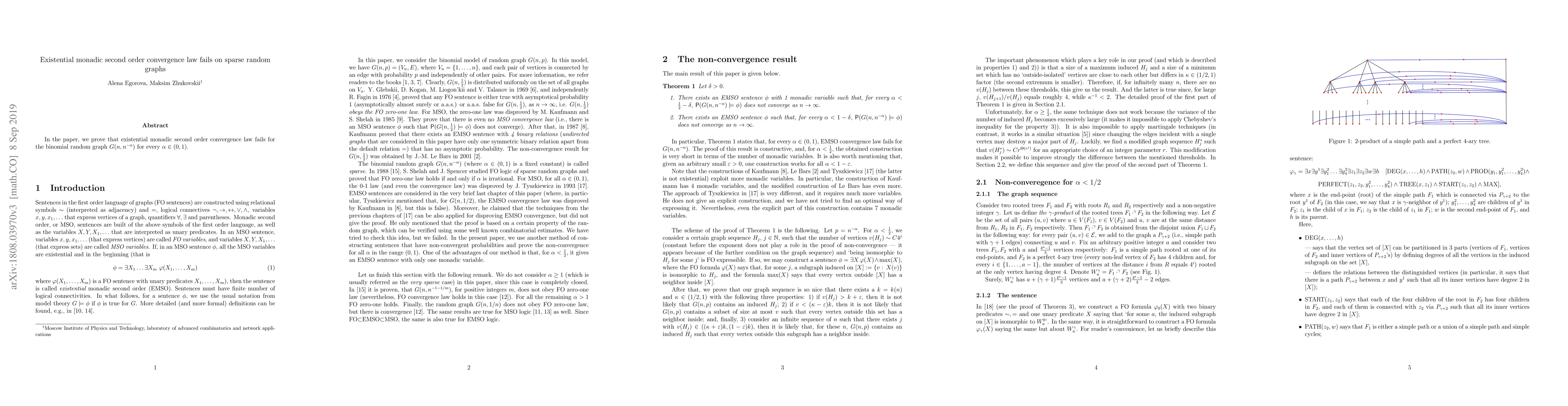 Summary: The paper demonstrates that the existential monadic second order convergence law does not hold for sparse random graphs generated by the binomial model $G(n,n^{-\alpha})$ for any $\alpha$ in the range $(0,1)$. This challenges the applicability of the convergence law in such graph settings.