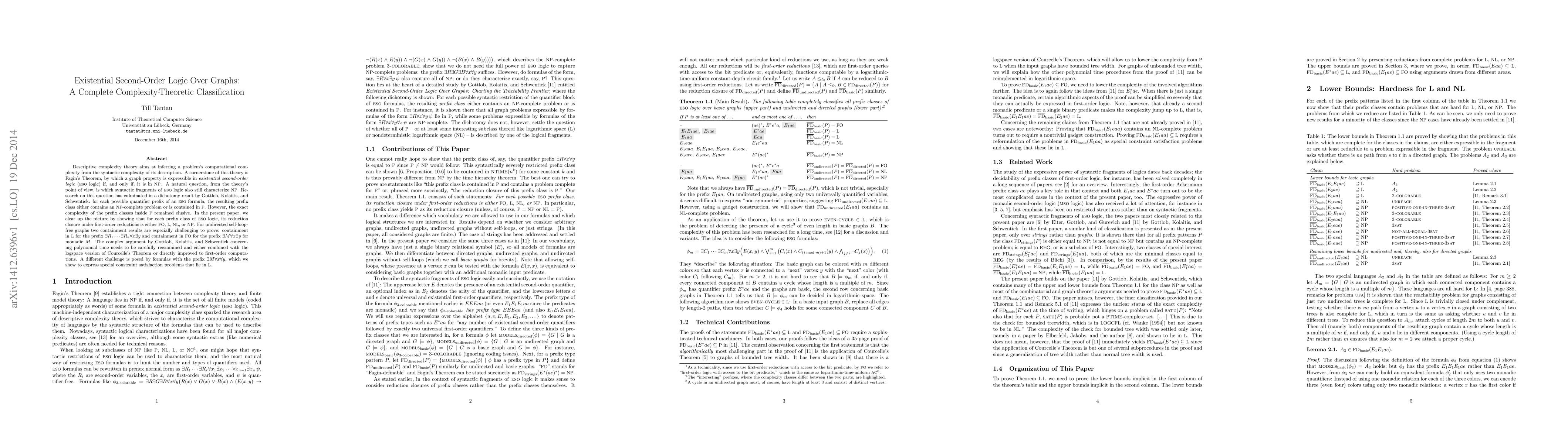 This paper provides a complete complexity-theoretic classification of existential second-order logic (ESO logic) over graphs, showing that each prefix class's reduction closure under first-order reductions falls within FO, L, NL, or NP. Special attention is given to proving containment in L and FO for specific prefixes on undirected, self-loop-free graphs.