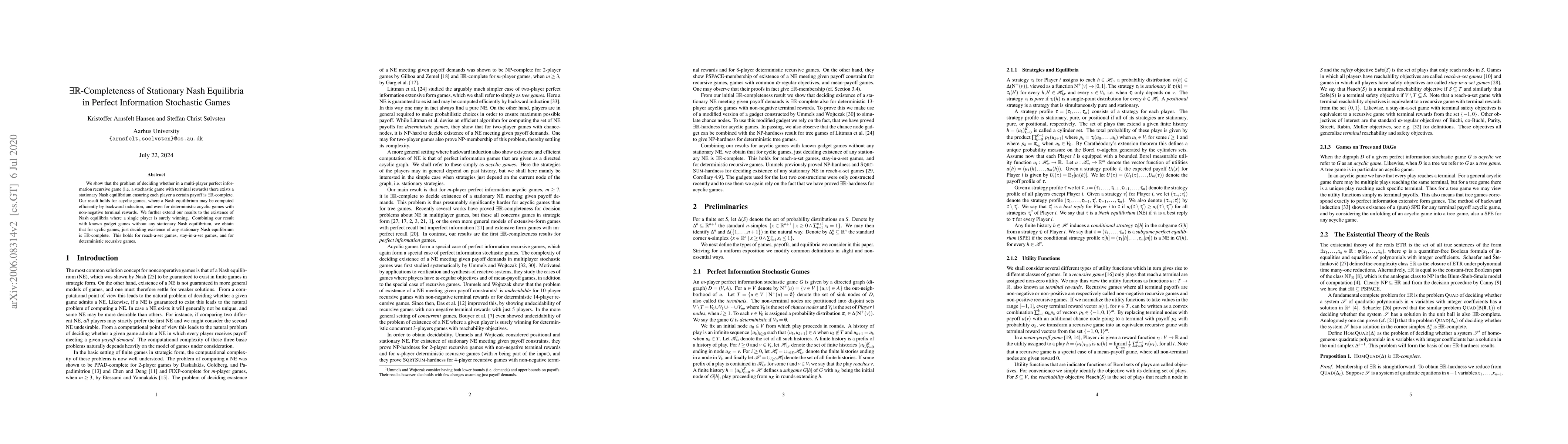 This paper demonstrates that determining the existence of a stationary Nash equilibrium in multi-player perfect information stochastic games is complete for the Existential Theory of the Reals. It applies to both acyclic and cyclic games, showing complexity differences based on game structure.