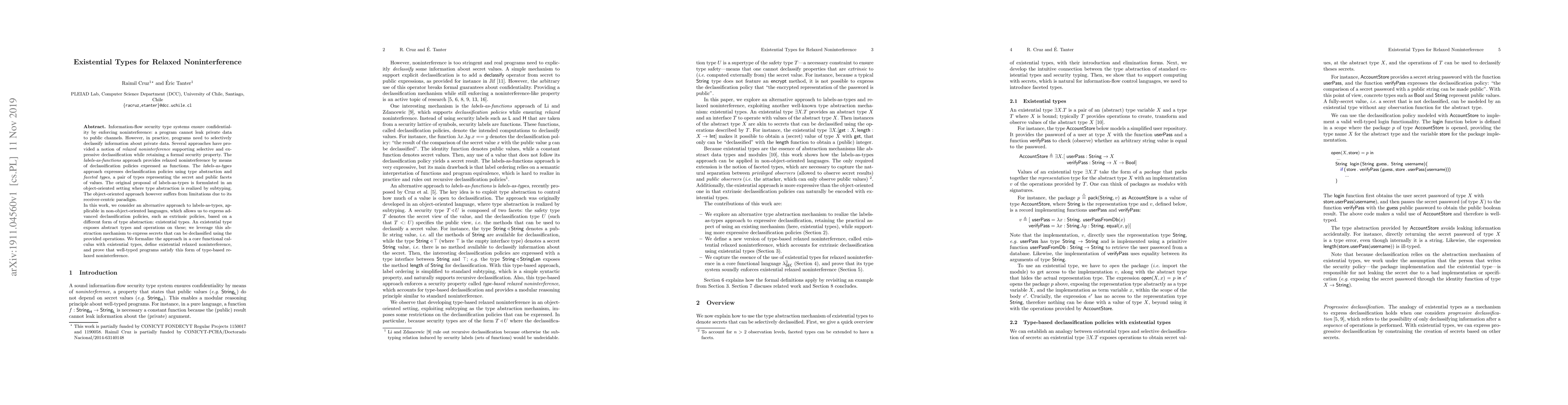 This paper proposes an alternative to labels-as-types for relaxed noninterference using existential types in non-object-oriented languages, allowing for advanced declassification policies. It formalizes and proves the security of this approach in a functional calculus.
