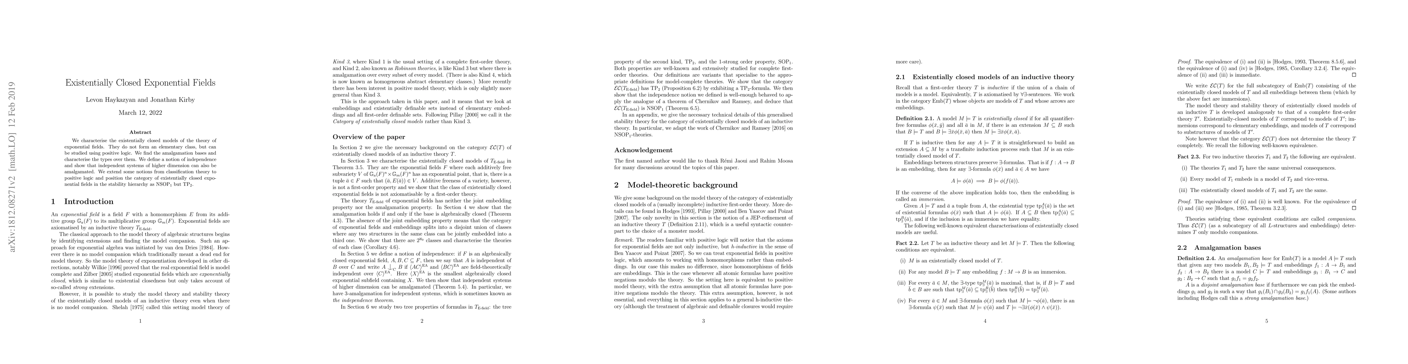 This paper characterizes existentially closed models within the theory of exponential fields, revealing they are not elementary but can be studied via positive logic. It introduces independence notions and positions these fields as NSOP$_1$ but TP$_2$ in the stability hierarchy.