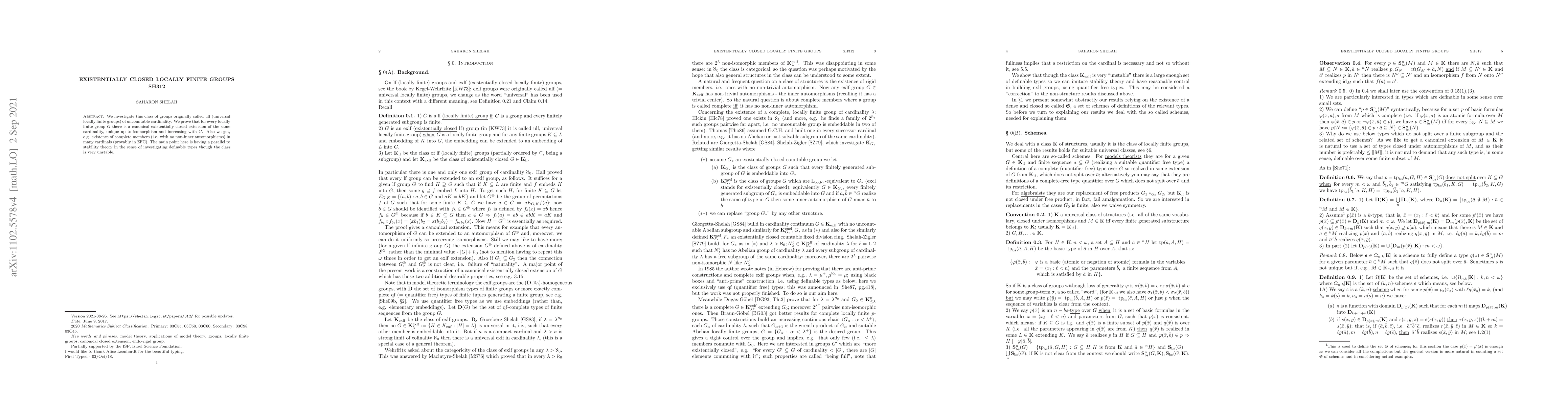 We investigate this class of groups originally called ulf (universal locally finite groups) of cardinality $\lambda$. We prove that for every locally finite group $G$ there is a canonical existentially closed extention of the same cardinality, unique up to isomorphism and increasing with $G$. Also we get, e.g. existence of complete members (i.e. with no non-inner automorphisms) in many cardinals (provably in ZFC). We also get a parallel to stability theory in the sense of investigating definable types.