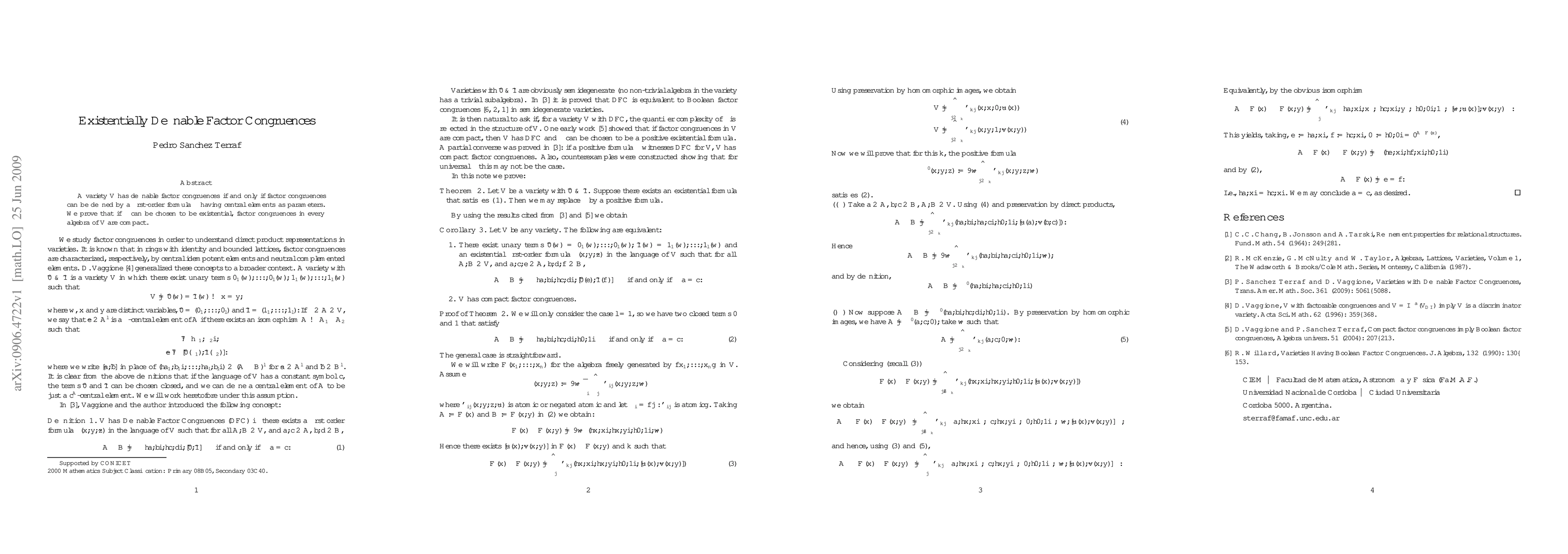 Summary: The paper proves that if a variety V allows factor congruences to be defined by existential first-order formulas with central elements as parameters, then all factor congruences in any algebra of V are compact. This establishes a connection between existential definability and the compactness of factor congruences.
