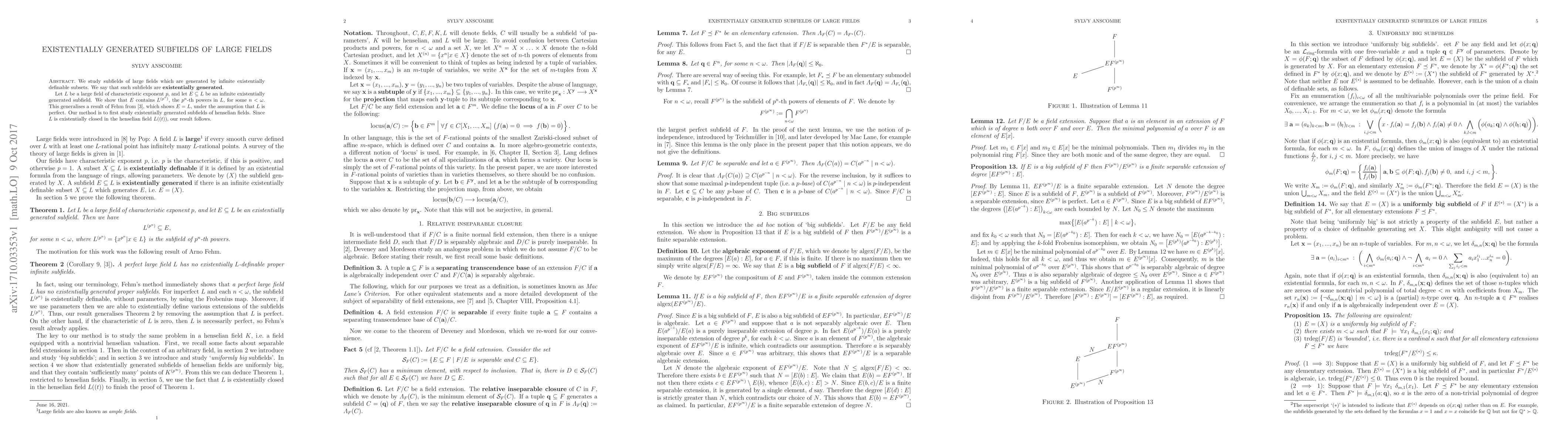 We study subfields of large fields which are generated by infinite existentially definable subsets. We say that such subfields are existentially generated. Let $L$ be a large field of characteristic exponent $p$, and let $E\subseteq L$ be an infinite existentially generated subfield. We show that $E$ contains $L^{(p^{n})}$, the $p^{n}$-th powers in $L$, for some $n<\omega$. This generalises a result of Fehm, which shows $E=L$ under the assumption that $L$ is perfect. Our method is to first study existentially generated subfields of henselian fields. Since $L$ is existentially closed in the henselian field $L((t))$, our result follows.