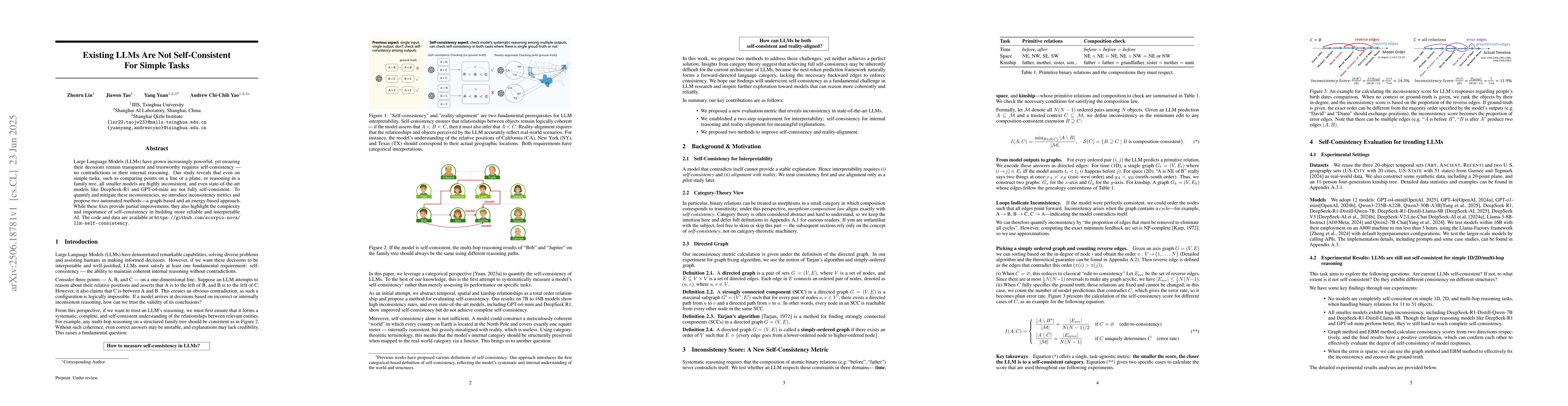 Large Language Models (LLMs) have grown increasingly powerful, yet ensuring their decisions remain transparent and trustworthy requires self-consistency -- no contradictions in their internal reasoning. Our study reveals that even on simple tasks, such as comparing points on a line or a plane, or reasoning in a family tree, all smaller models are highly inconsistent, and even state-of-the-art models like DeepSeek-R1 and GPT-o4-mini are not fully self-consistent. To quantify and mitigate these inconsistencies, we introduce inconsistency metrics and propose two automated methods -- a graph-based and an energy-based approach. While these fixes provide partial improvements, they also highlight the complexity and importance of self-consistency in building more reliable and interpretable AI. The code and data are available at https://github.com/scorpio-nova/llm-self-consistency.