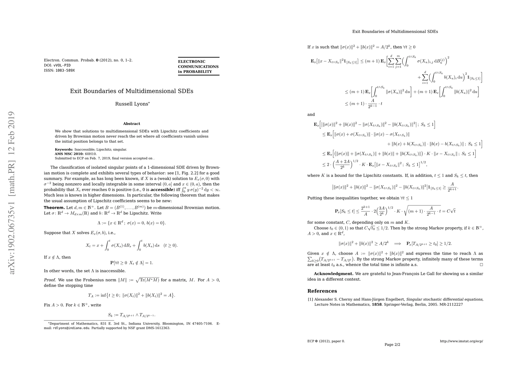 We show that solutions to multidimensional SDEs with Lipschitz coefficients and driven by Brownian motion never reach the set where all coefficients vanish unless the initial position belongs to that set.