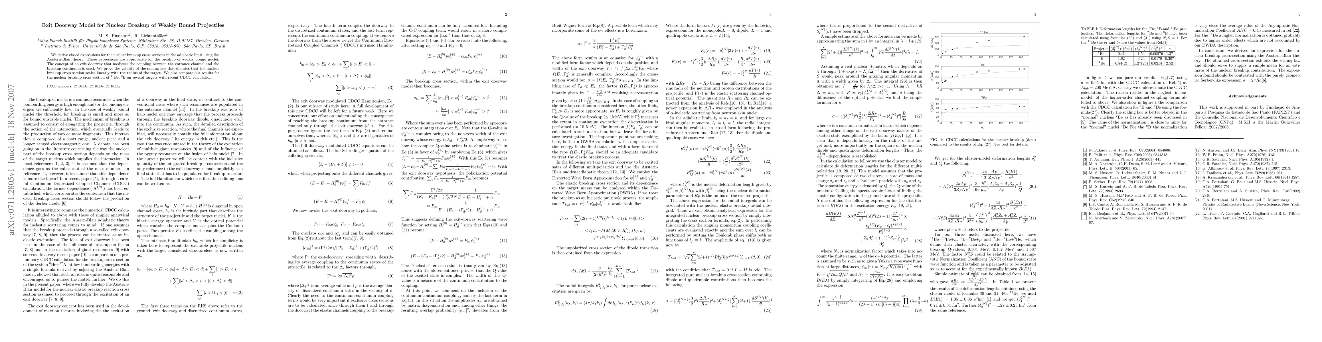 This paper derives closed expressions for nuclear breakup cross sections in the adiabatic limit using Austern-Blair theory, focusing on weakly bound nuclei. It introduces an exit doorway model and validates a scaling law for these cross sections, comparing results for $^{11}$Be and $^8$B with recent CDCC calculations.