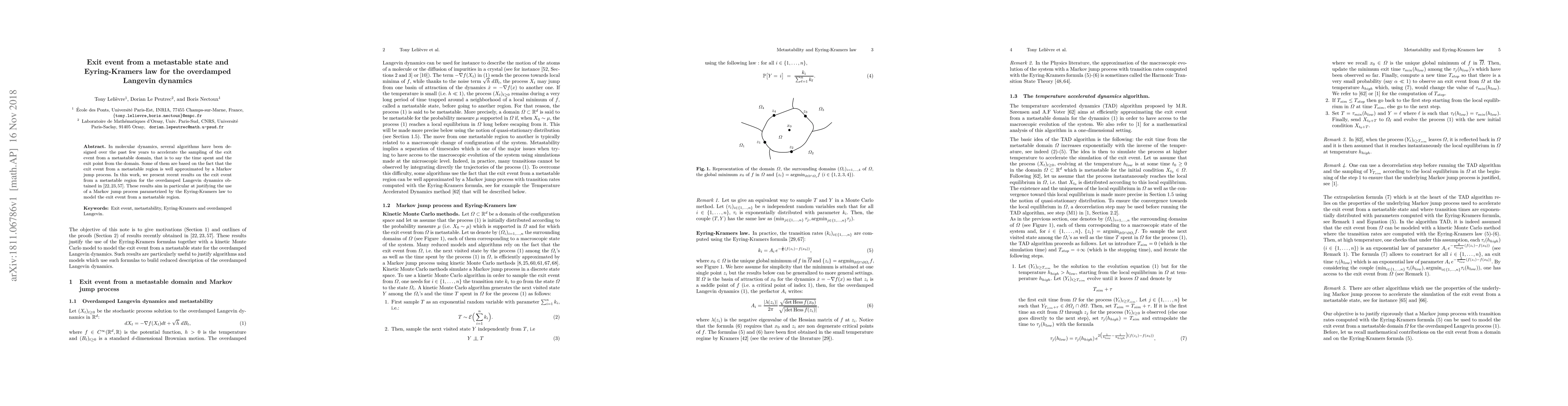 In molecular dynamics, several algorithms have been designed over the past few years to accelerate the exit event from a metastable region of the configuration space. Some of them are based on the fact that the exit event from a metastable region is well approximated by a Markov jump process. In this work, we present recent results on the exit event from a metastable region for the overdamped Langevin dynamics obtained in [17, 18, 49]. These results aim in particular at justifying the use of a Markov jump process parametrized by the Eyring-Kramers law to model the exit event from a metastable region.