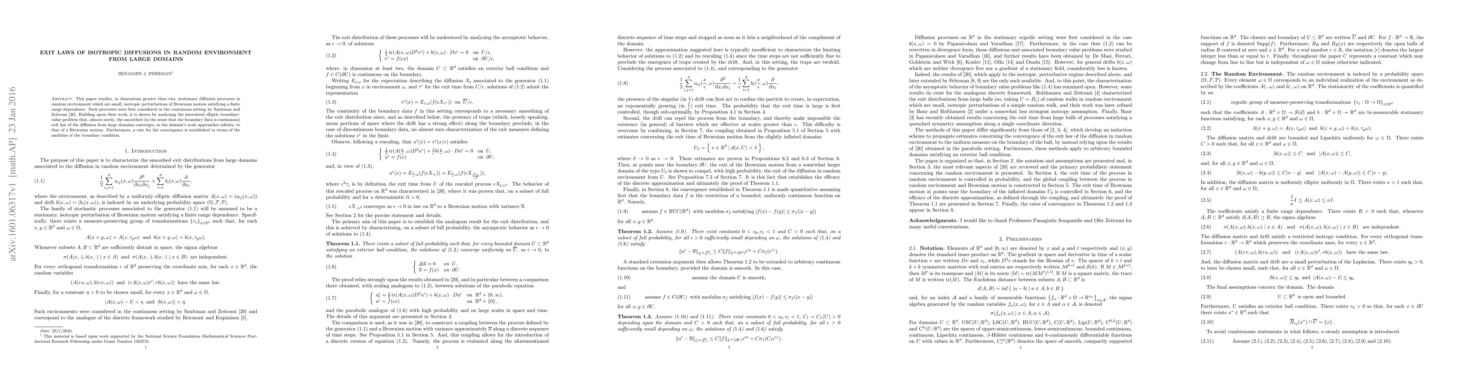 This paper investigates isotropic diffusions in random environments, showing that their exit laws from large domains converge to those of Brownian motion as the domain size increases. The convergence rate is also determined based on the modulus of the boundary condition.