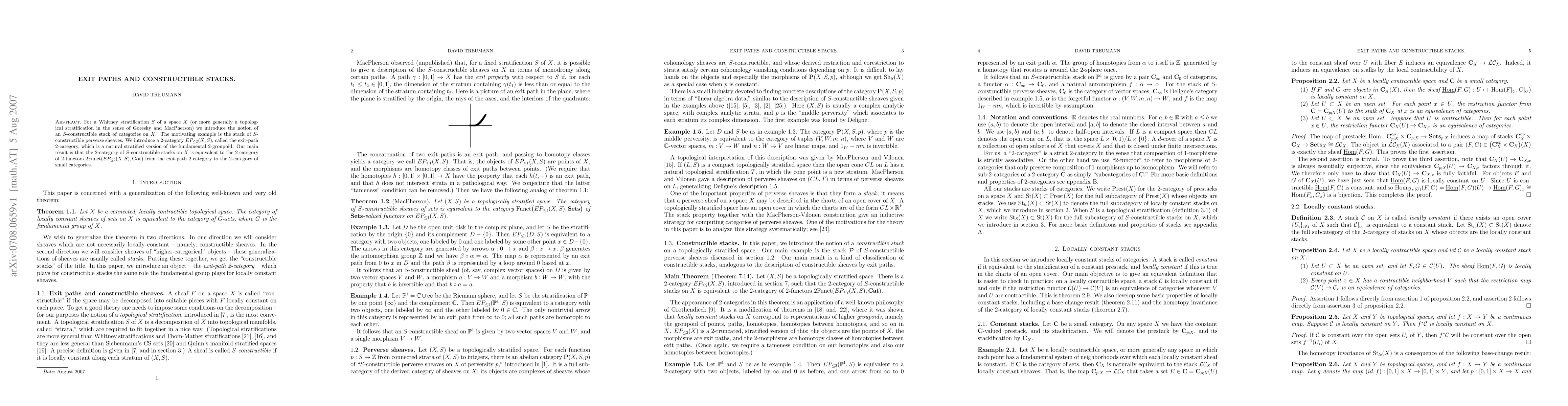 For a Whitney stratification S of a space X (or more generally a topological stratification in the sense of Goresky and MacPherson) we introduce the notion of an S-constructible stack of categories on X. The motivating example is the stack of S-constructible perverse sheaves. We introduce a 2-category $EP_{\leq 2}(X,S)$, called the exit-path 2-category, which is a natural stratified version of the fundamental 2-groupoid. Our main result is that the 2-category of S-constructible stacks on X is equivalent to the 2-category of 2-functors from $EP_{\leq 2}(X,S)$ to the 2-category of small categories.