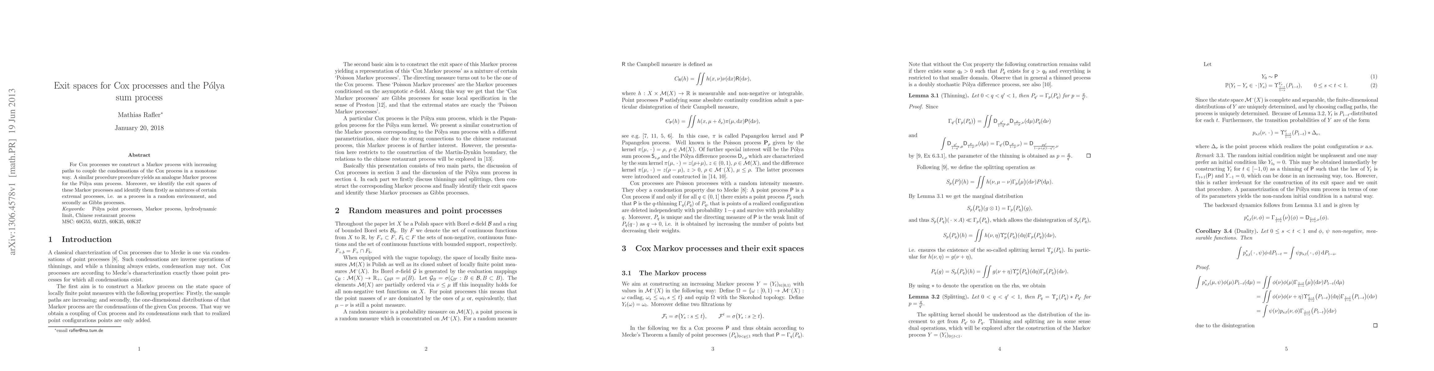 This paper constructs Markov processes for Cox and Pólya sum processes to couple their condensations, identifies their exit spaces, and shows they are mixtures of extremal processes and Gibbs processes.