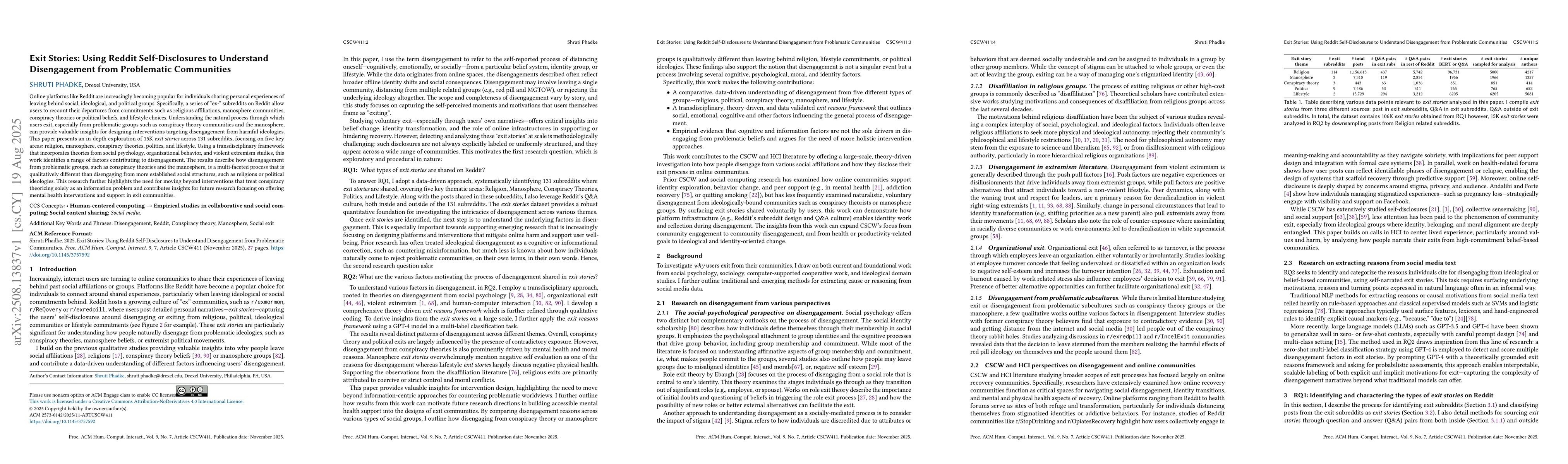 This study analyzed 15,000 exit stories from 131 subreddits focusing on religion, manosphere, conspiracy theories, politics, and lifestyle using a transdisciplinary framework incorporating theories from social psychology, organizational behavior, and violent extremism studies.