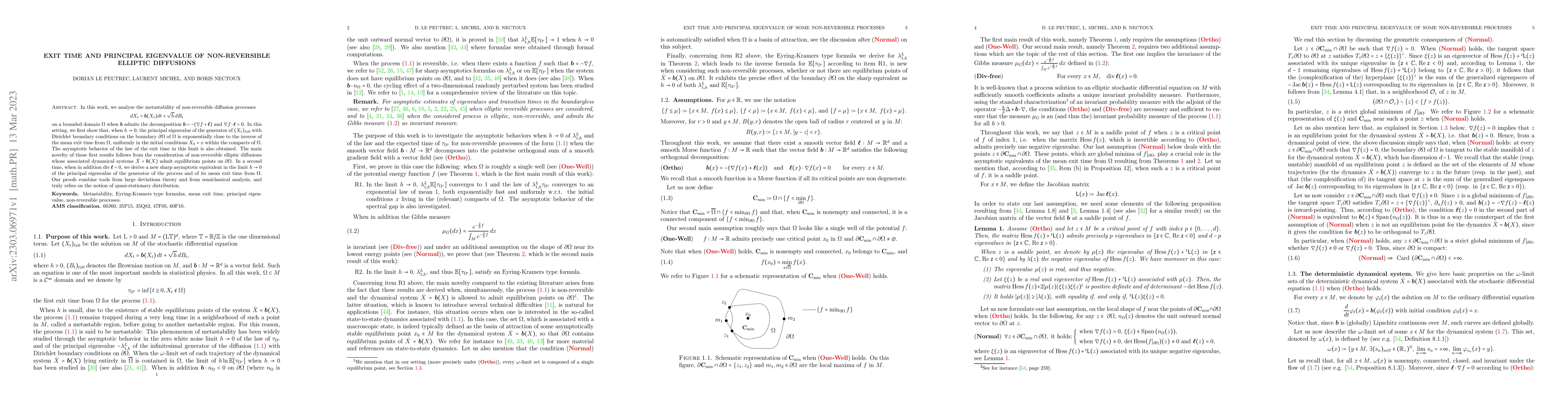 In this work, we analyse the metastability of non-reversible diffusion processes $$dX_t=\boldsymbol{b}(X_t)dt+\sqrt h\,dB_t$$ on a bounded domain $\Omega$ when $\mathbf{b}$ admits the decomposition $\mathbf{b}=-(\nabla f+\mathbf{\ell})$ and $\nabla f \cdot \mathbf{\ell}=0$. In this setting, we first show that, when $h\to 0$, the principal eigenvalue of the generator of $(X_t)_{t\ge 0}$ with Dirichlet boundary conditions on the boundary $\partial\Omega$ of $\Omega$ is exponentially close to the inverse of the mean exit time from $\Omega$, uniformly in the initial conditions $X_0=x$ within the compacts of $\Omega$. The asymptotic behavior of the law of the exit time in this limit is also obtained. The main novelty of these first results follows from the consideration of non-reversible elliptic diffusions whose associated dynamical systems $\dot X=\mathbf{b}(X)$ admit equilibrium points on $\partial\Omega$. In a second time, when in addition $\div \mathbf{\ell} =0$, we derive a new sharp asymptotic equivalent in the limit $h\to 0$ of the principal eigenvalue of the generator of the process and of its mean exit time from $\Omega$. Our proofs combine tools from large deviations theory and from semiclassical analysis, and truly relies on the notion of quasi-stationary distribution.