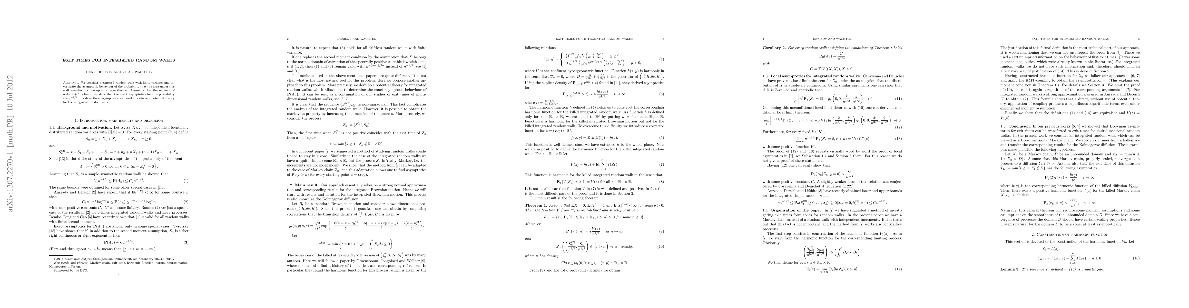 We consider a centered random walk with finite variance and investigate the asymptotic behaviour of the probability that the area under this walk remains positive up to a large time $n$. Assuming that the moment of order $2+\delta$ is finite, we show that the exact asymptotics for this probability are $n^{-1/4}$. To show these asymptotics we develop a discrete potential theory for the integrated random walk.